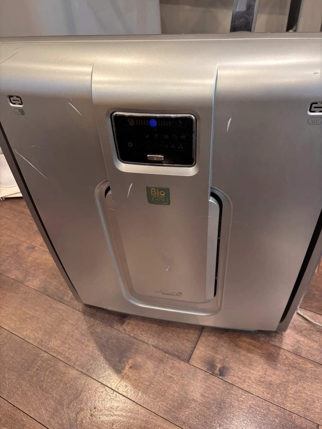 Sharp air purifier with Bio GS technology. This unit is silver and has a digital display for settings. It features Plasmacluster Ion technology to clean the air.