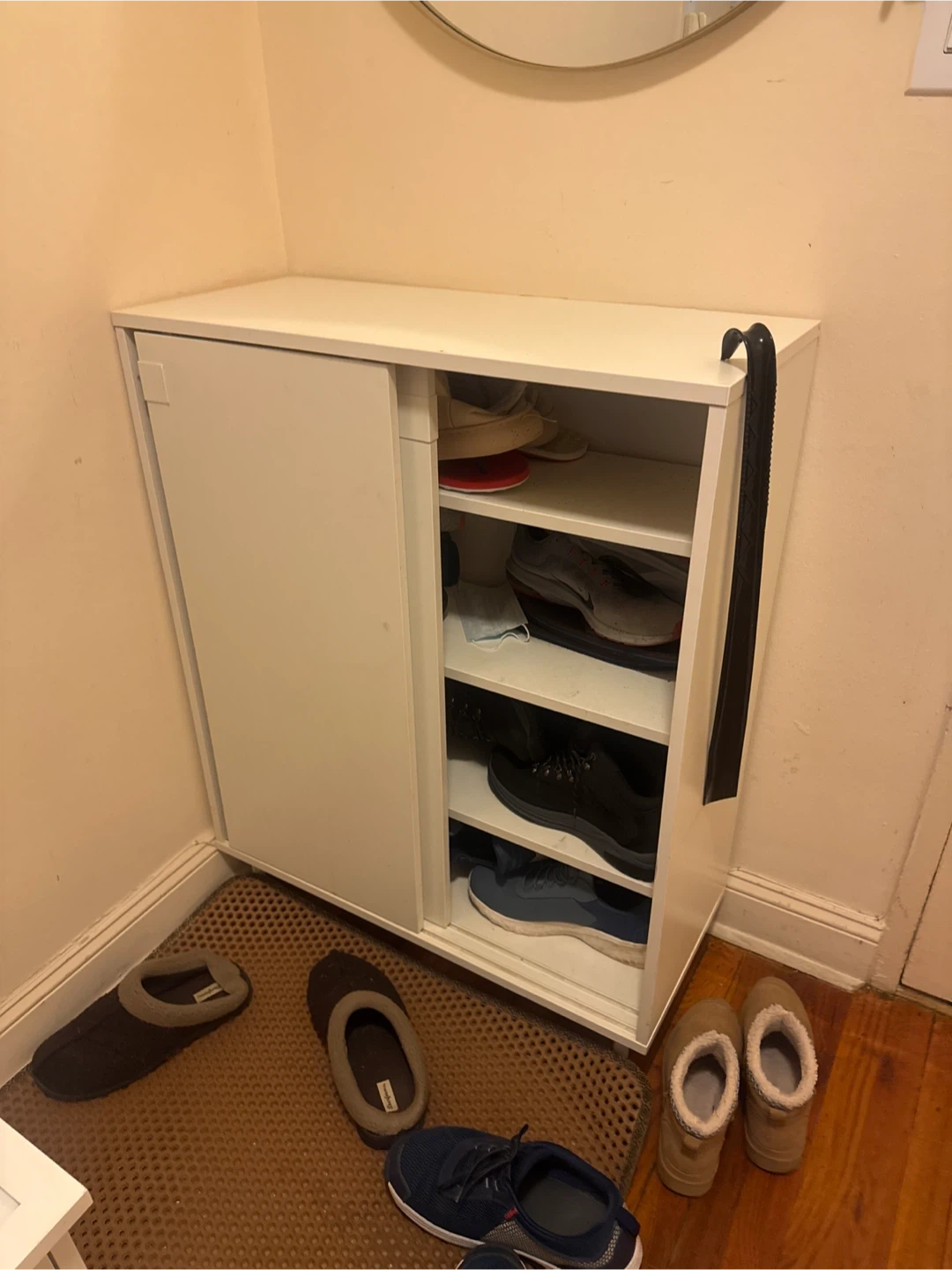 A white shoe cabinet with a sliding door and multiple shelves for storage. It's approximately 2.5 feet wide and 1.5 feet tall. This cabinet holds several pairs of shoes neatly.