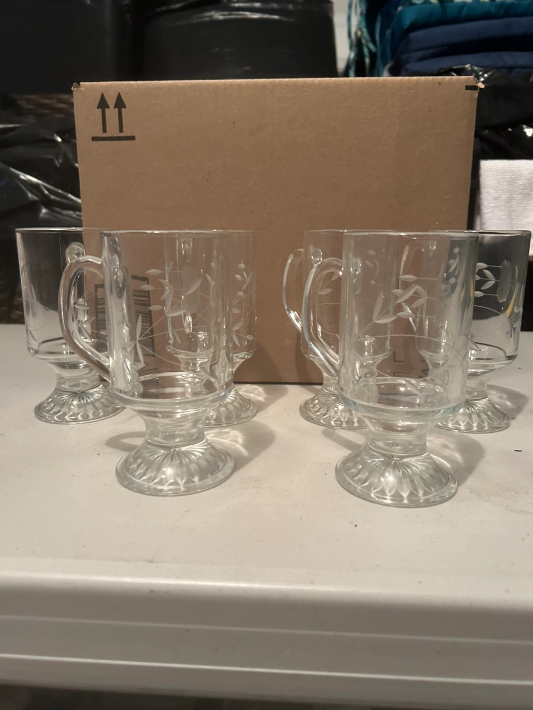 This is a set of six clear glass mugs. They feature etched floral designs and have a footed base. Perfect for serving hot beverages like coffee or tea!