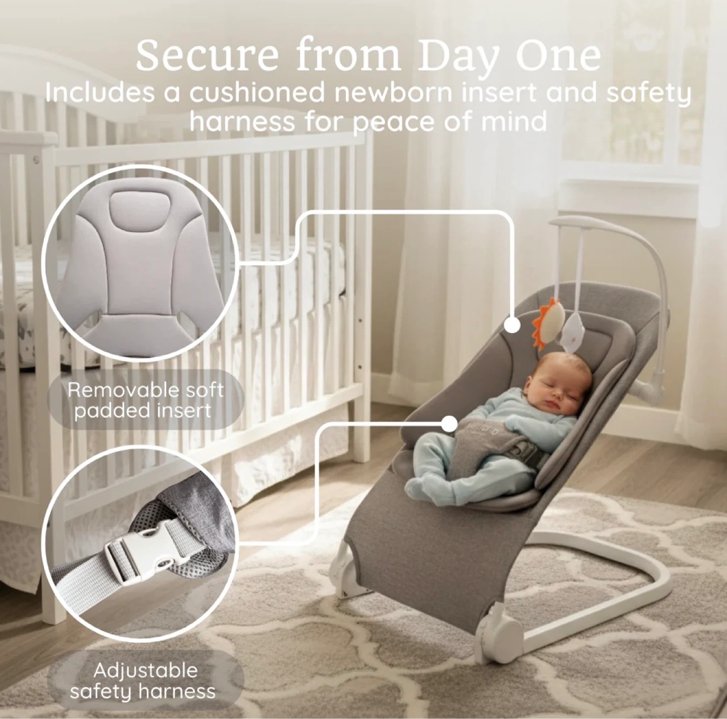 Designed for everyday life, this baby bouncer offers three recline positions for active play and peaceful naps. It's lightweight to carry and easy to clean with a fabric seat that unzips. Includes a removable toy bar, a cushioned newborn insert, and a carrying bag.