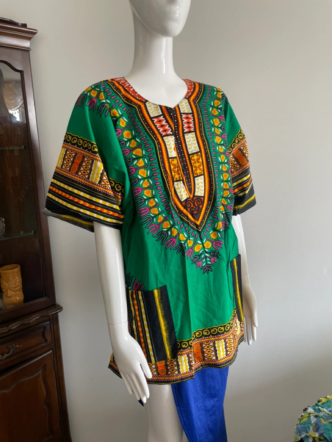 A vibrant Dashiki print tunic shirt. Short sleeves and a V-neck design. It's made of lightweight fabric, perfect for casual wear.