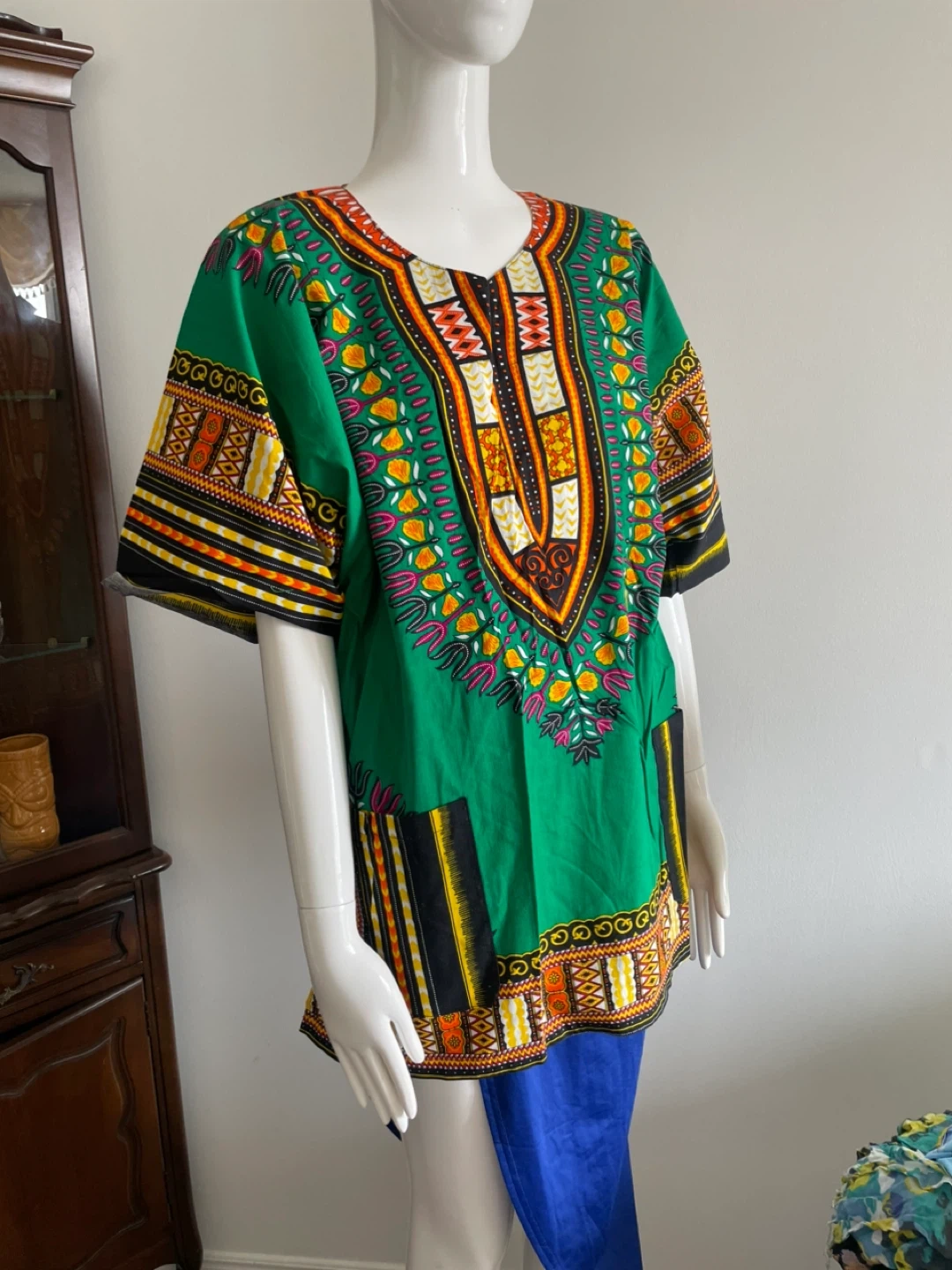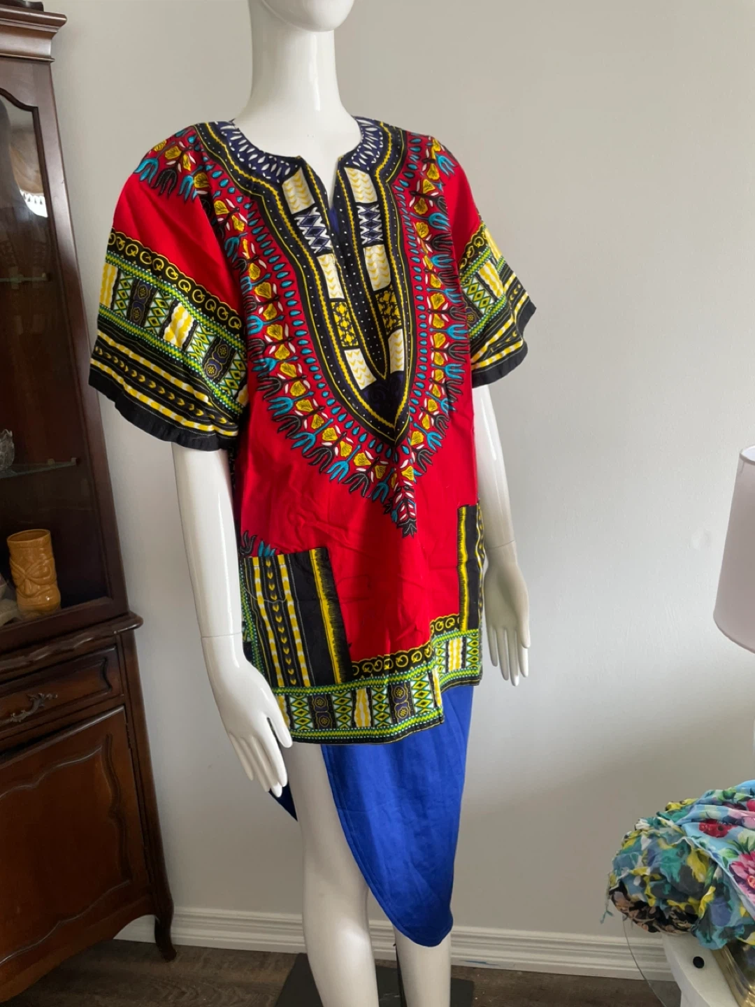 A vibrant Dashiki print tunic shirt. Short sleeves and a V-neck design. It's made of lightweight fabric, perfect for casual wear.