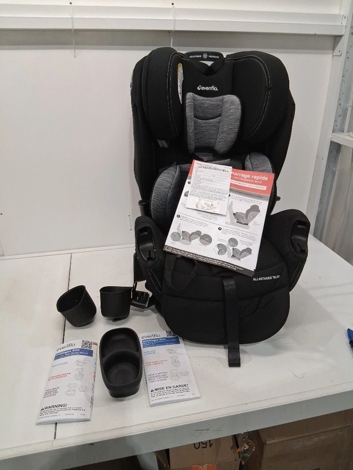 BRAND NEW! Never used. This Evenflo All4Stages Slim+ convertible car seat grows with your child from newborn to booster, up to 10 years of use. It's a space-saving design that fits easily in most vehicles and can even allow for 3 car seats across.