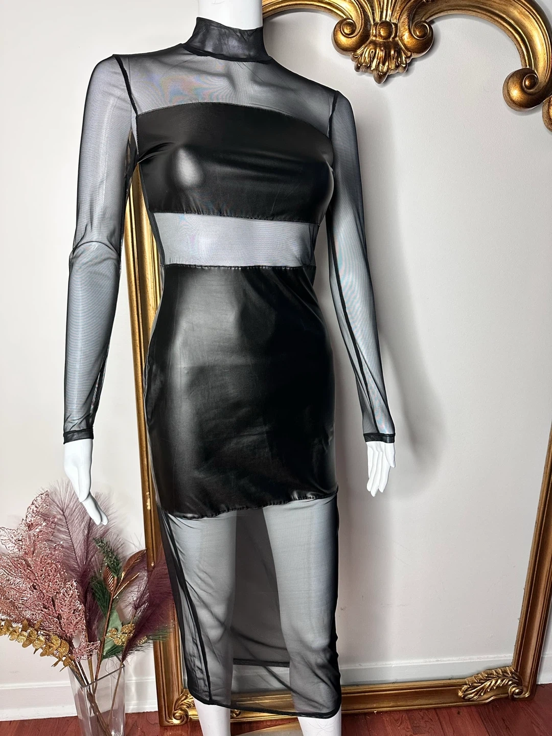 This stylish black dress features a mesh top and long sleeves, with faux leather accents on the bodice and skirt. It's a unique piece that's sure to turn heads!