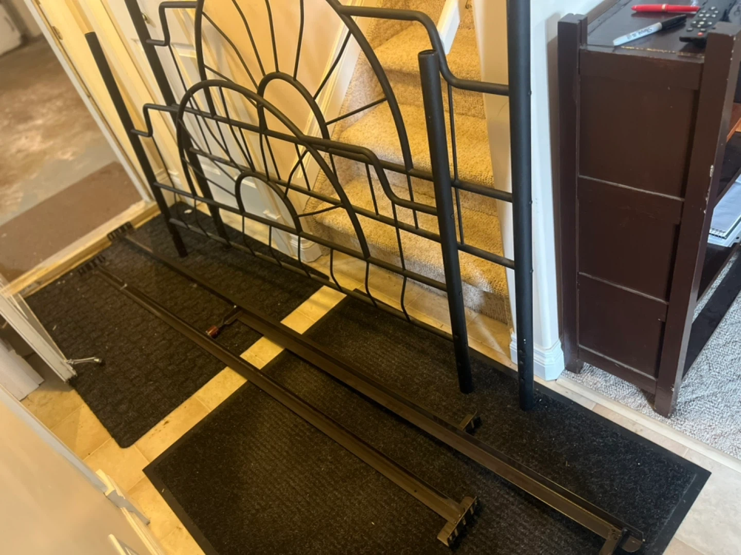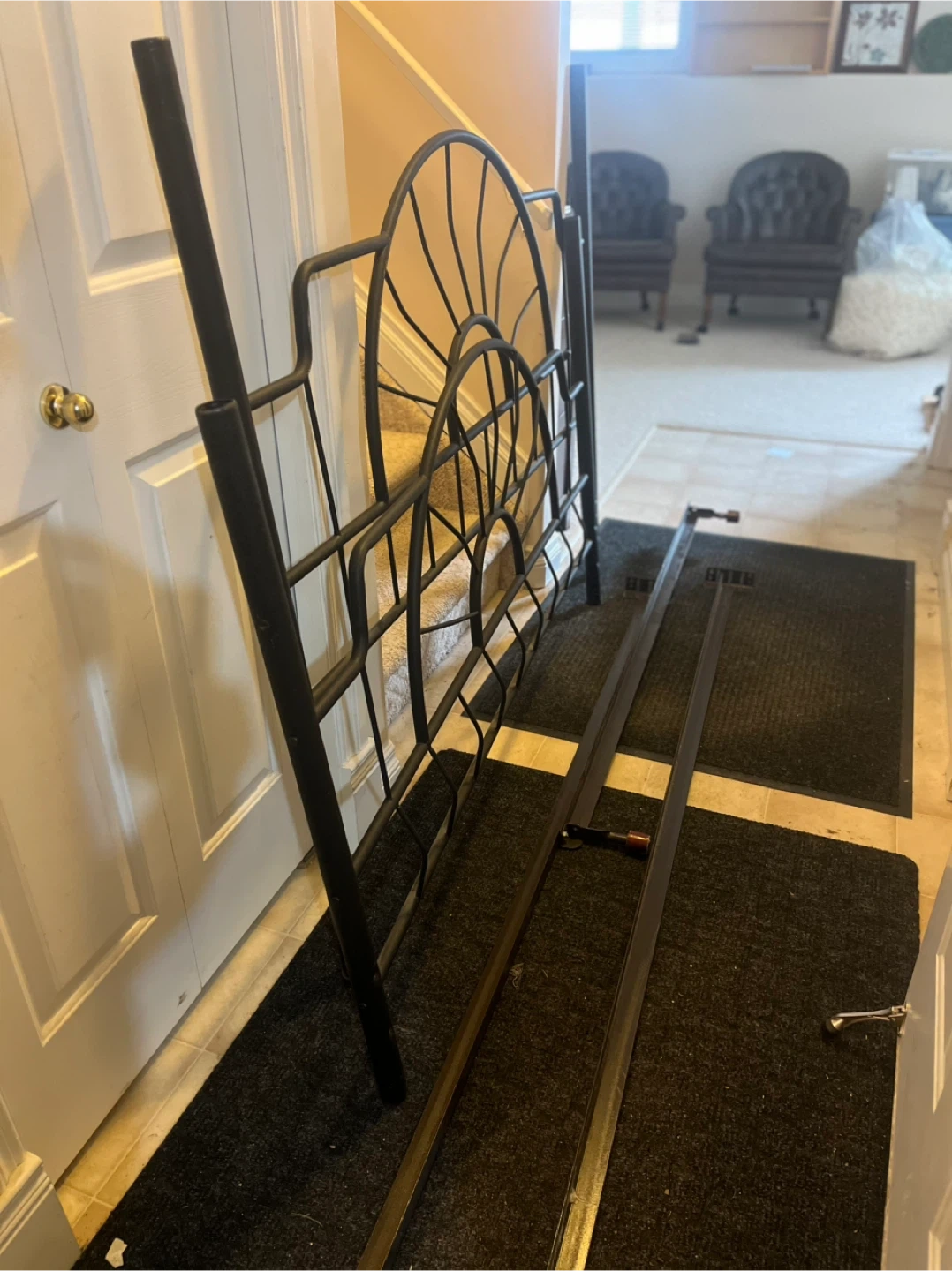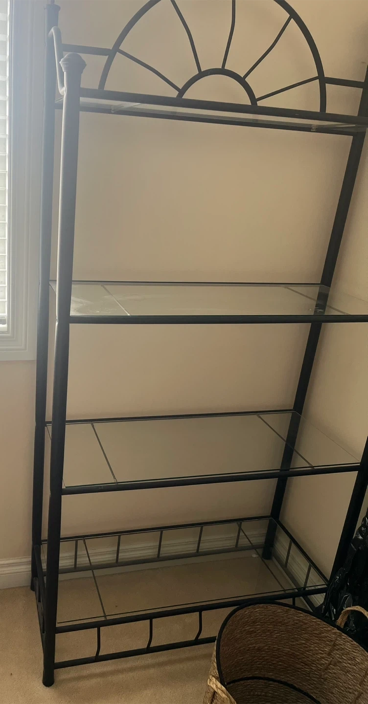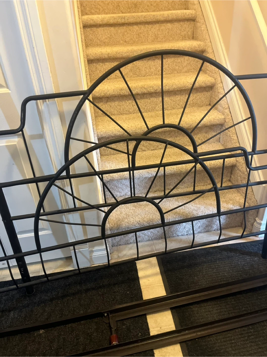 Black metal double bed frame with decorative headboard and footboard. Includes side rails and support slats. Sturdy construction for durability. 2 shelves and matching vanity table with stool.