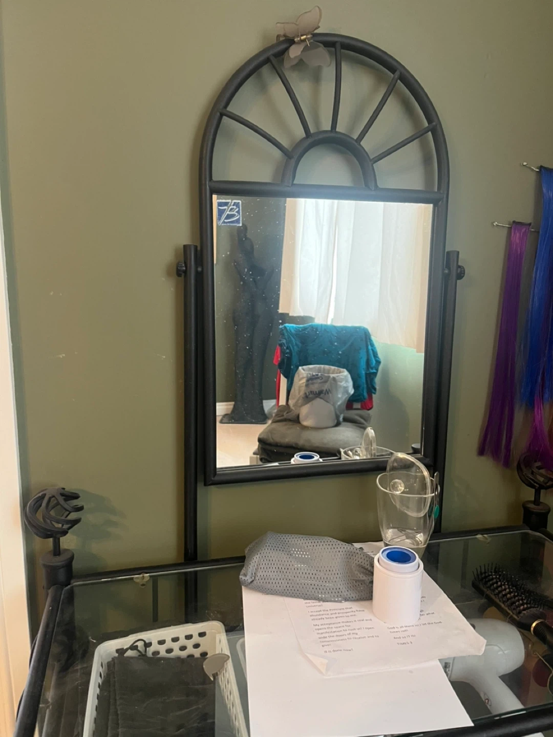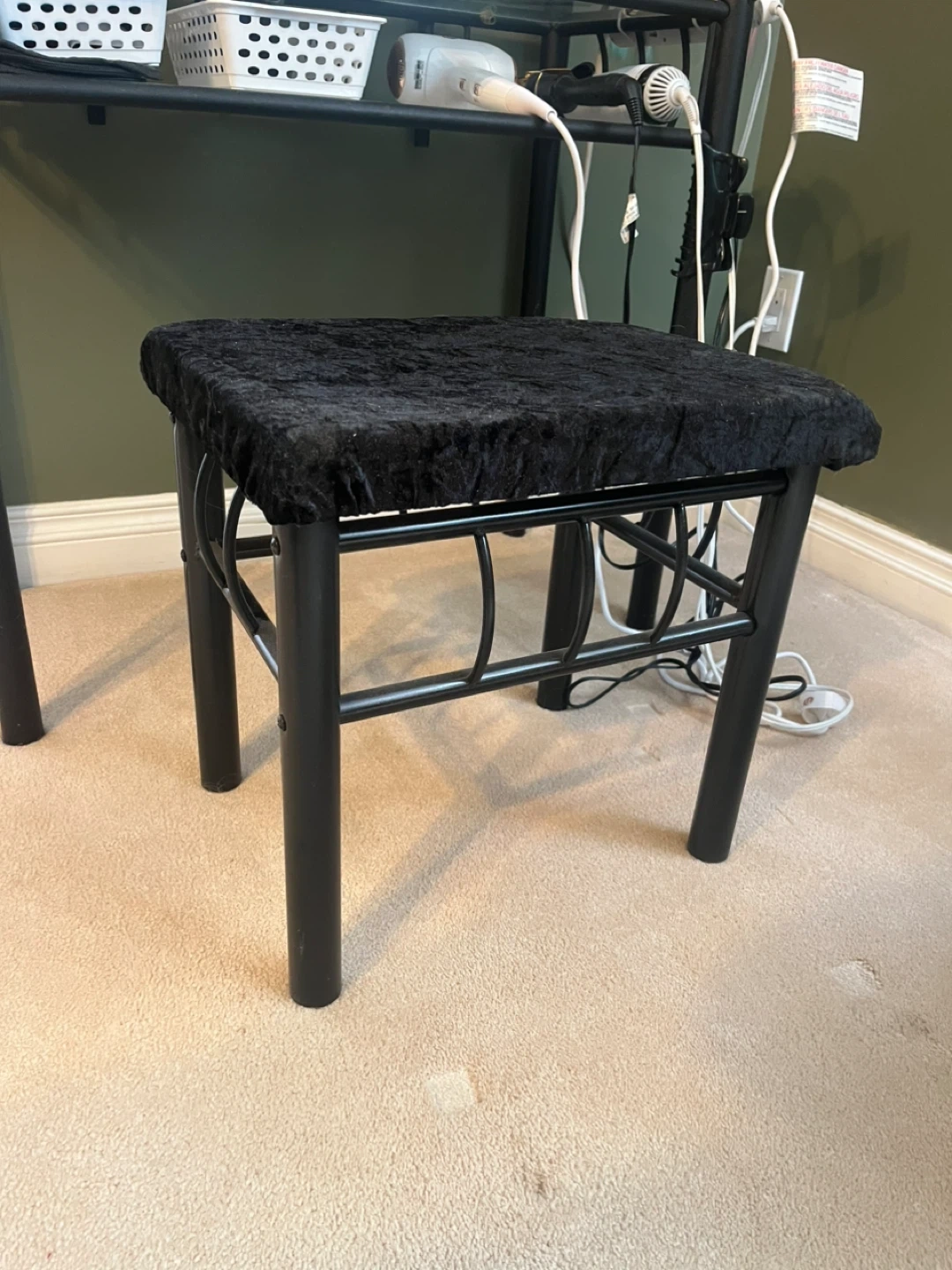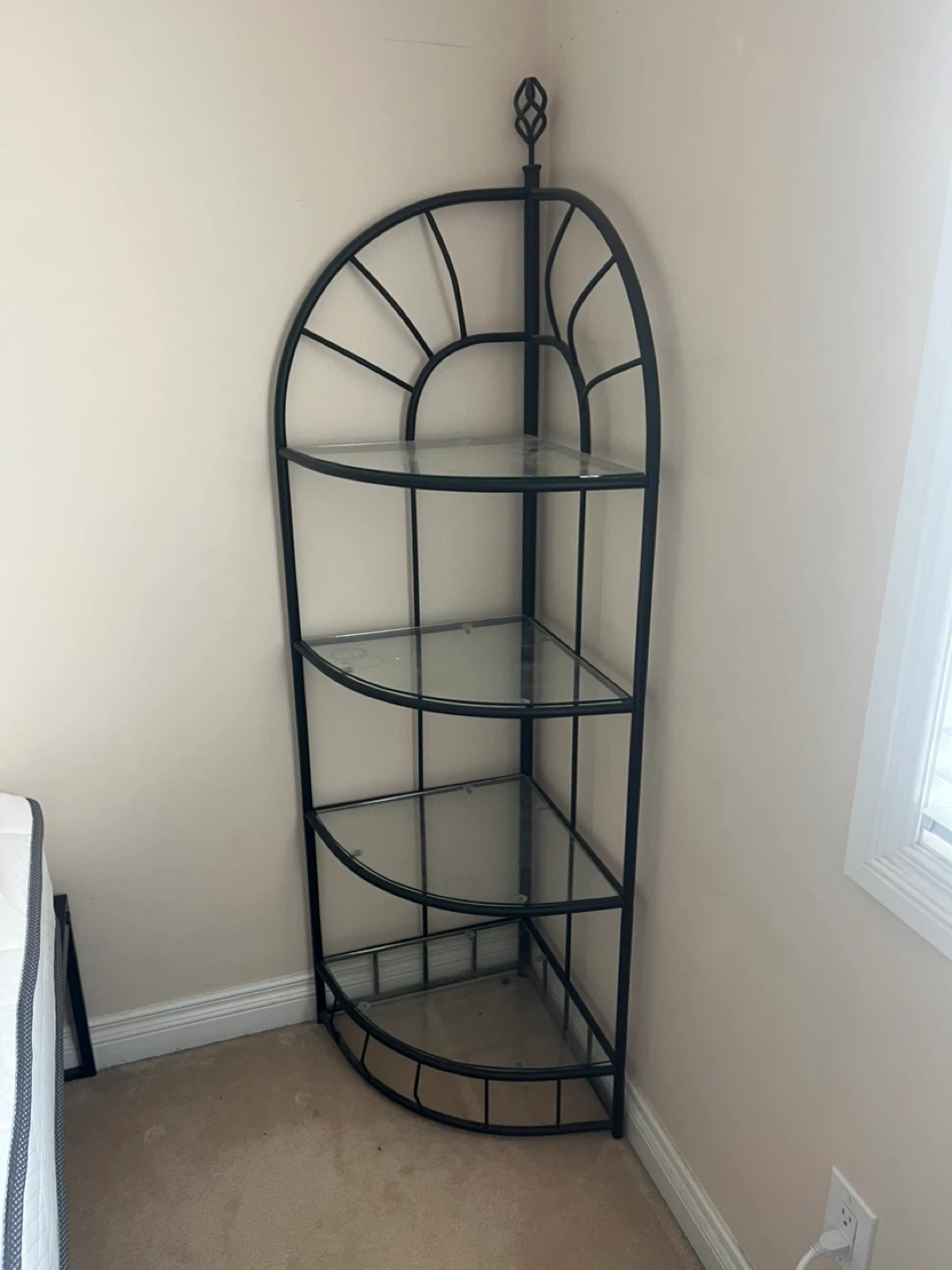 Black metal double bed frame with decorative headboard and footboard. Includes side rails and support slats. Sturdy construction for durability. 2 shelves and matching vanity table with stool.