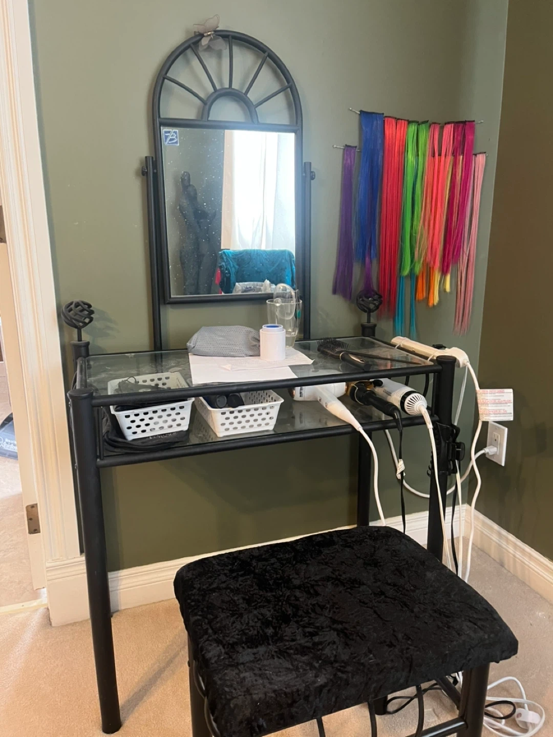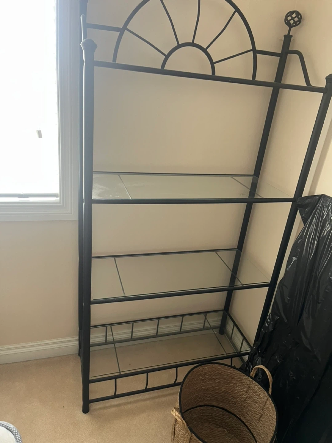 Black metal double bed frame with decorative headboard and footboard. Includes side rails and support slats. Sturdy construction for durability. 2 shelves and matching vanity table with stool.