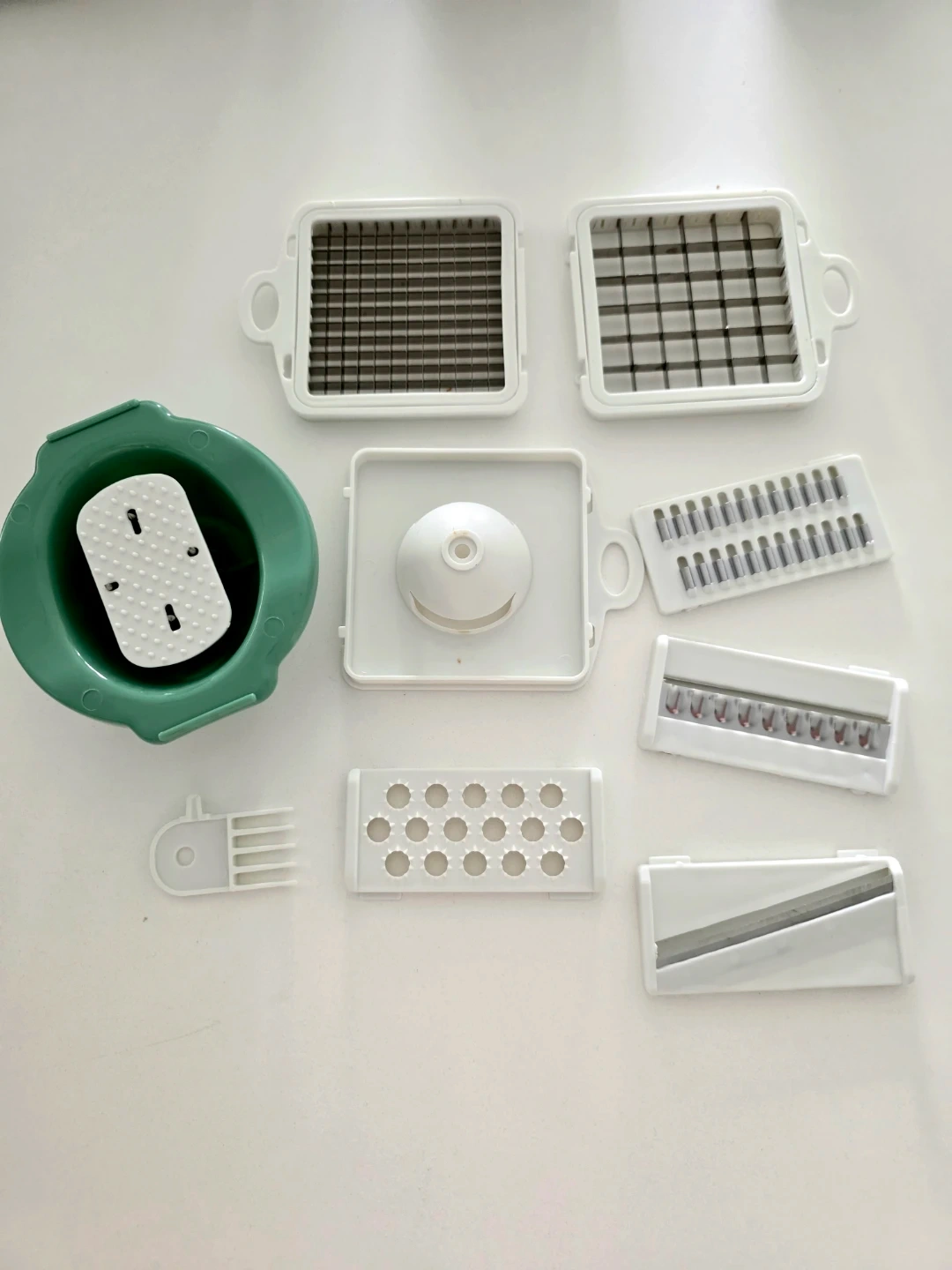 Includes multiple blades for slicing, dicing, and chopping vegetables, and an egg white separator.