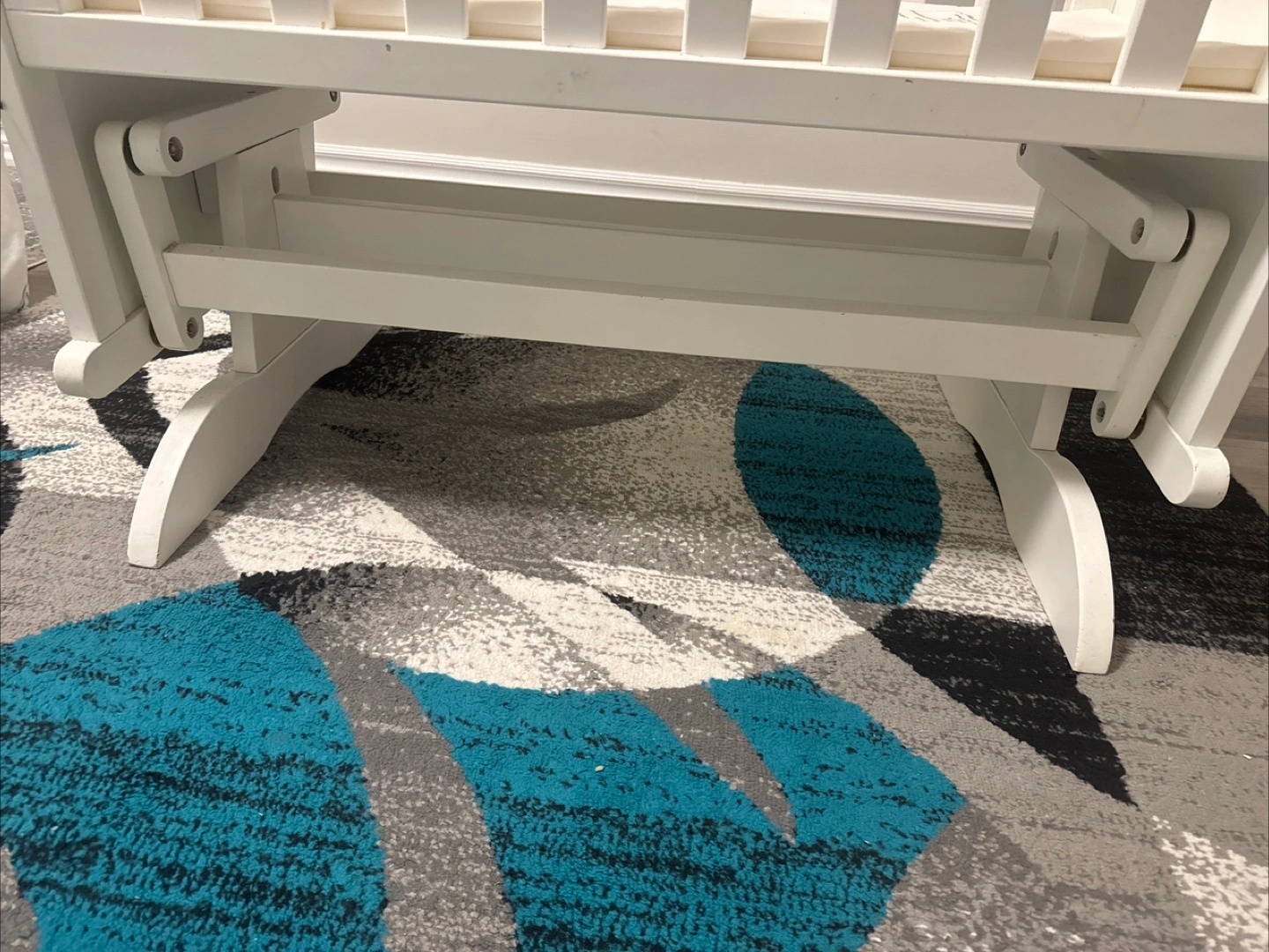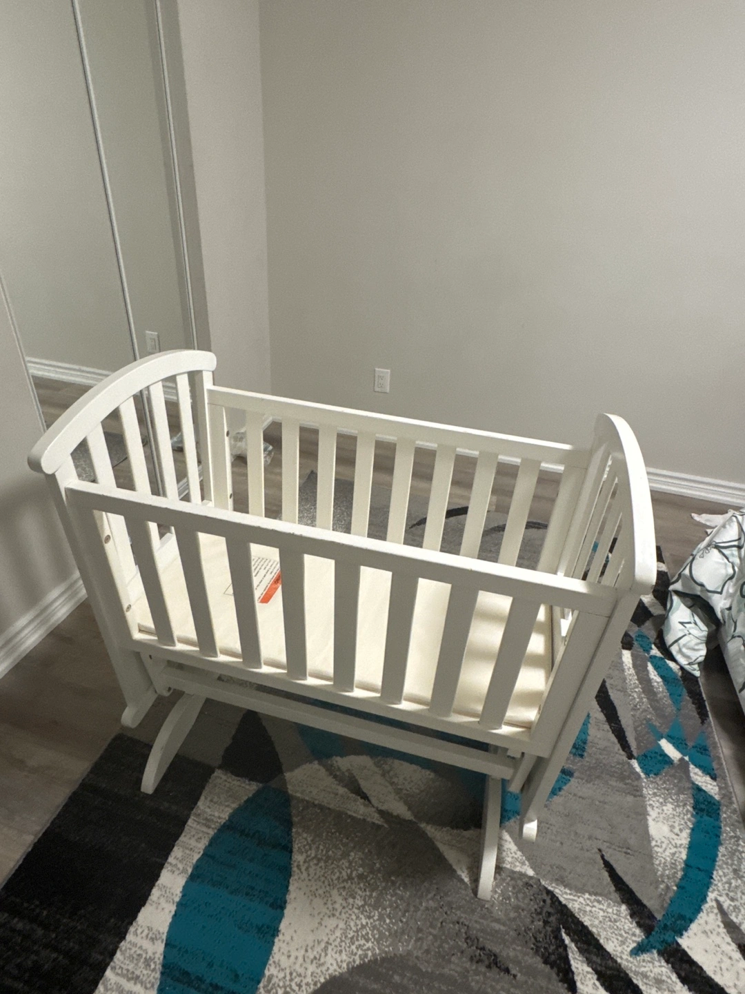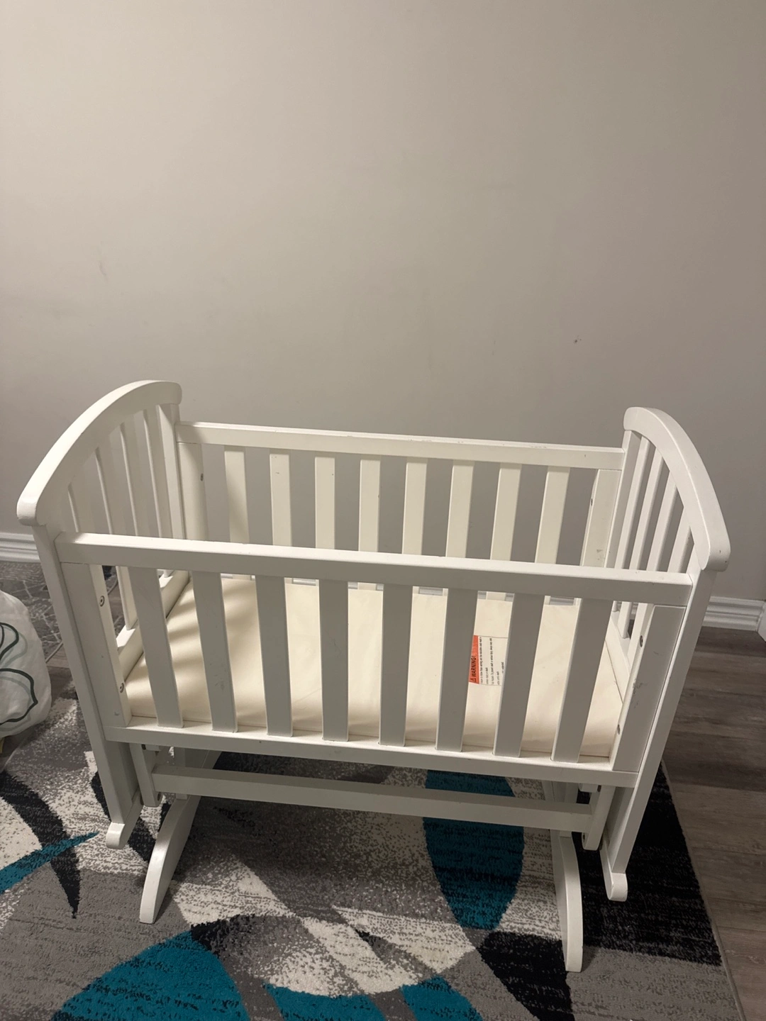 We could only use it for a short time because our baby grew quickly. Clean, sturdy, and perfect for a comfortable sleep. The crib can rock. Only has a few small paint scratches in some areas, which do not affect its use. Price is reasonable.