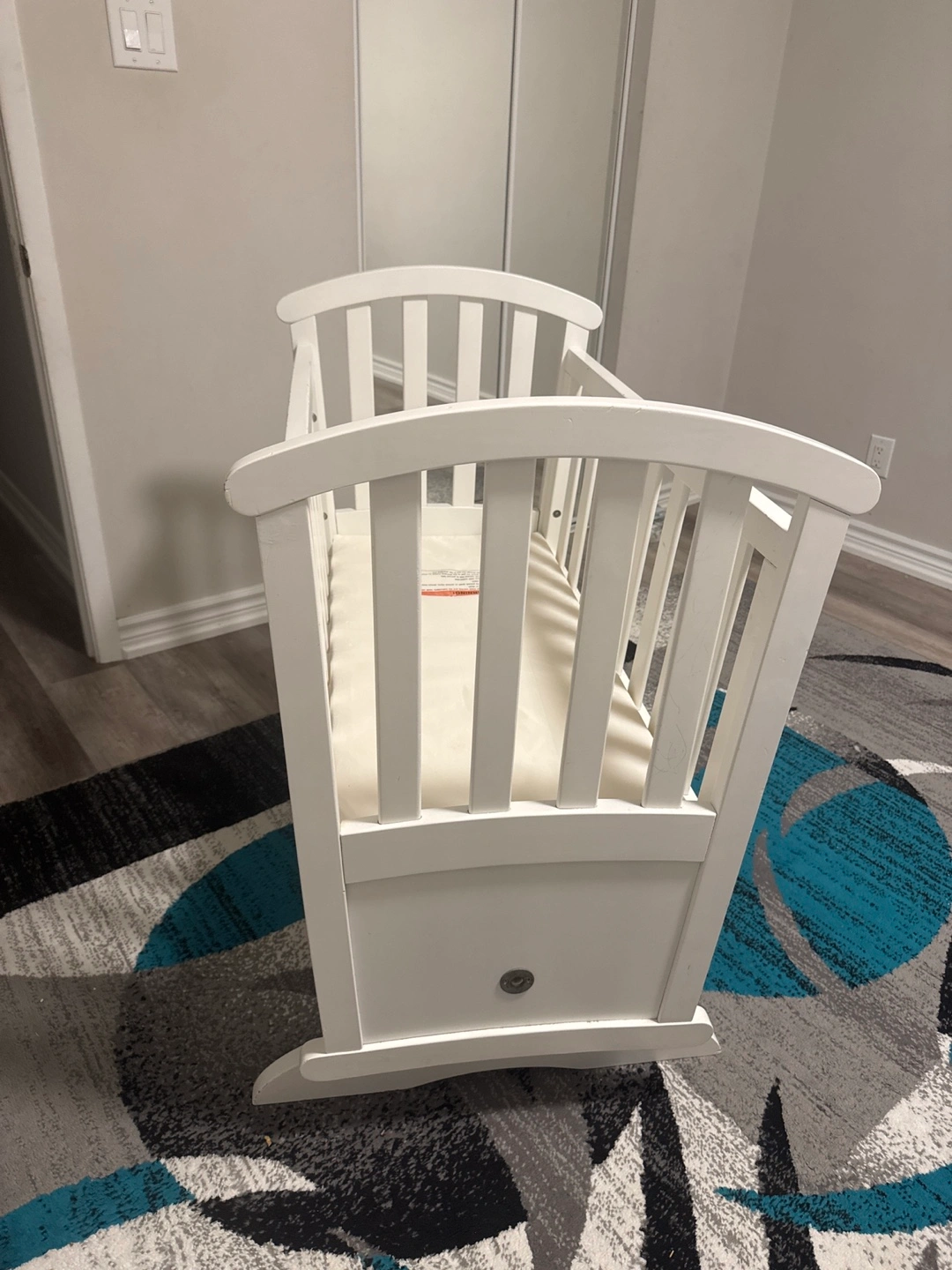 We could only use it for a short time because our baby grew quickly. Clean, sturdy, and perfect for a comfortable sleep. The crib can rock. Only has a few small paint scratches in some areas, which do not affect its use. Price is reasonable.