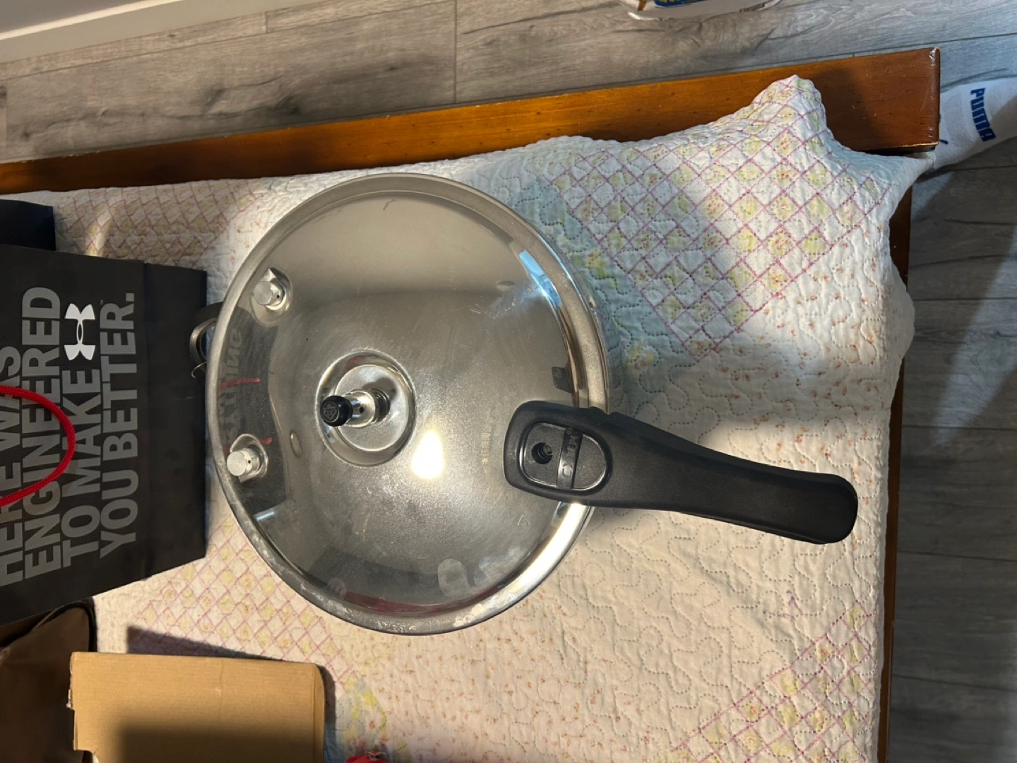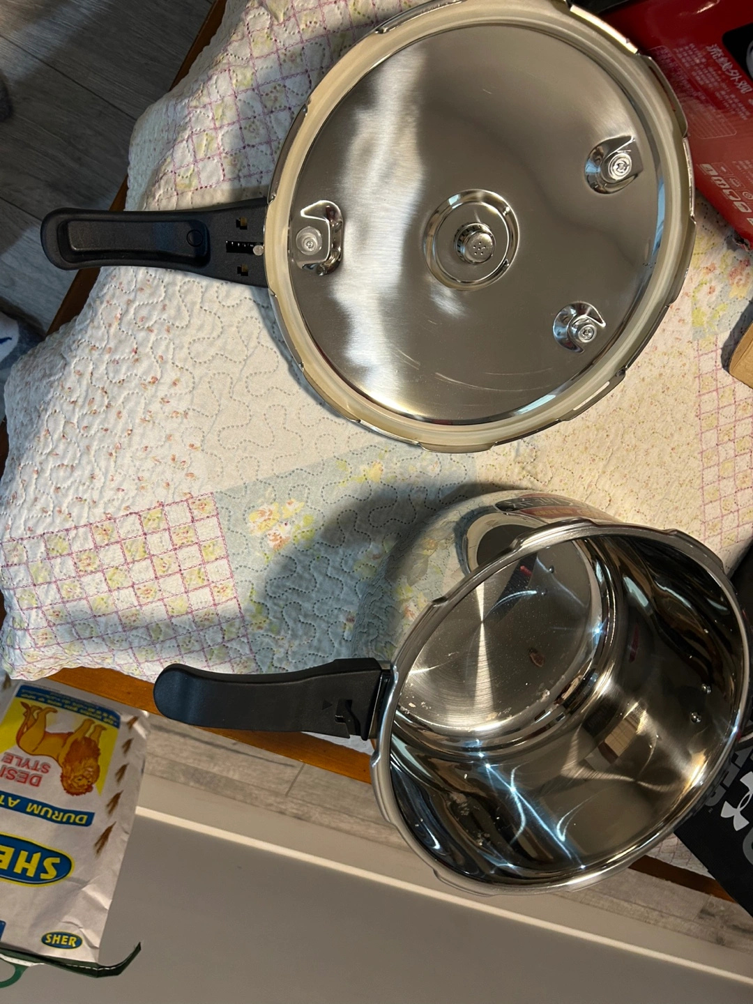 Six-litre stainless steel pressure cooker. Includes pot and lid. Black plastic handles. Box damaged but never used