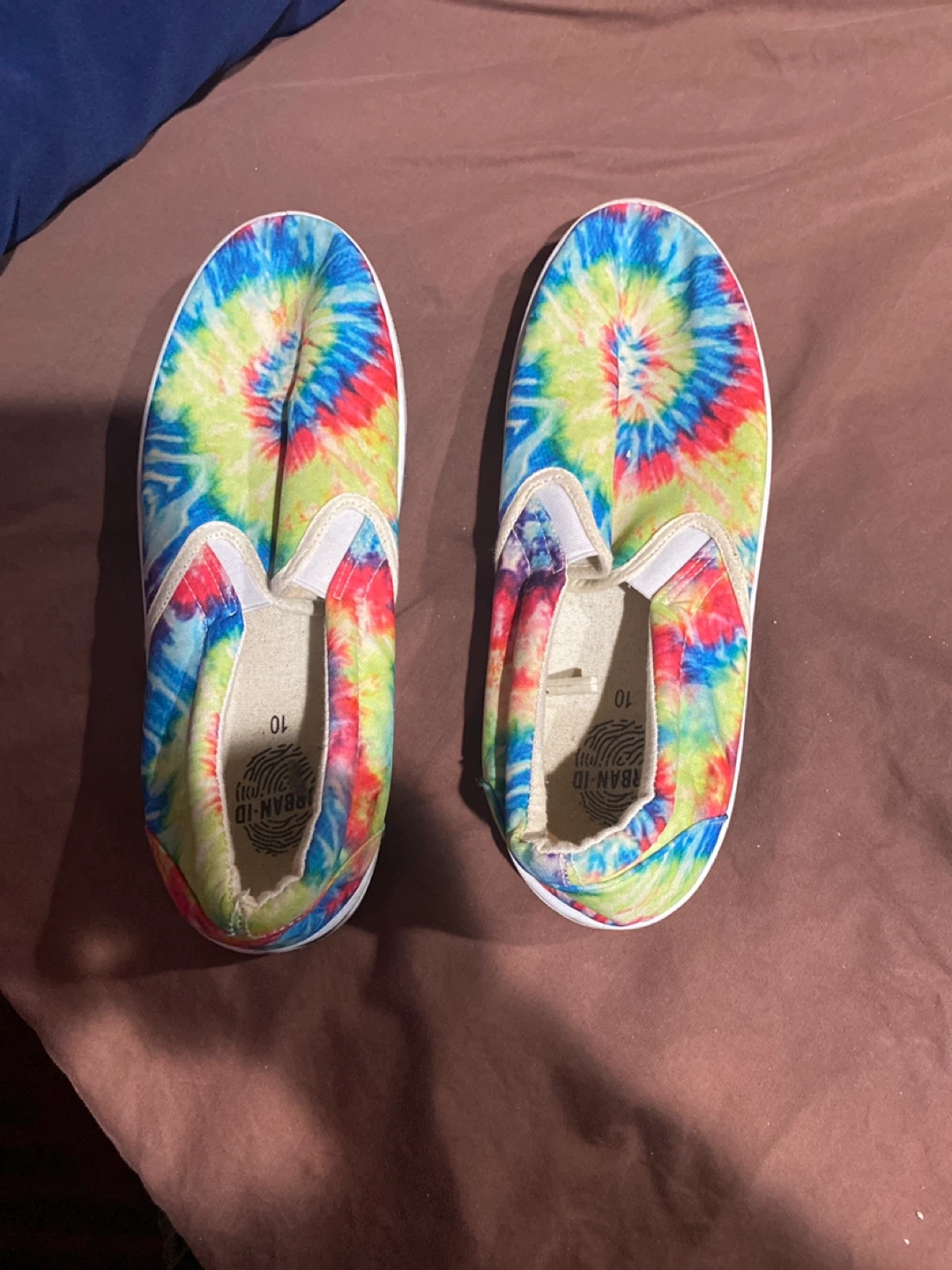 Check out these fun and colourful Urban-ID slip-on shoes! They feature a vibrant tie-dye pattern. The size is 10.