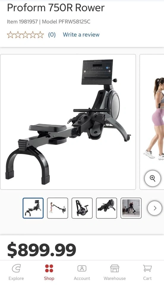 Why pay $1018.57 at Costco when you can pay $750 cash. Big savings. Foldable Pro-Form 750R rowing machine. Great for workouts at home. Has a digital display, foot straps, and a comfortable seat. Folds up for easy storage.