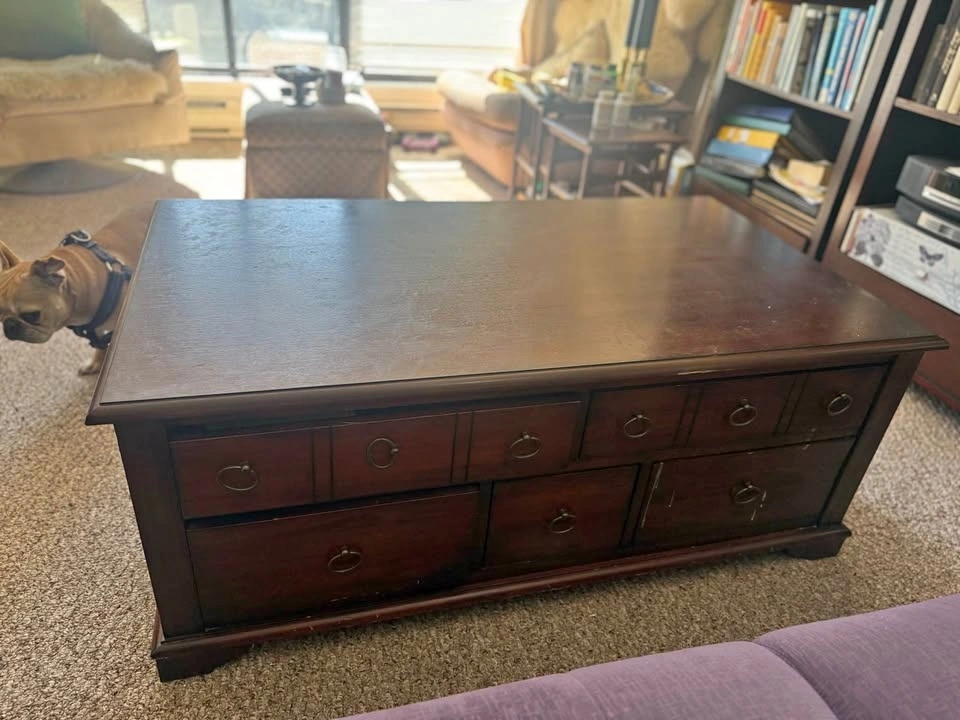 Solid wood coffee table with multiple drawers. 47.5” long, 27” wide, 19” high. Unit is solid wood so quite heavy. Must pick up in Port Coquitlam.
