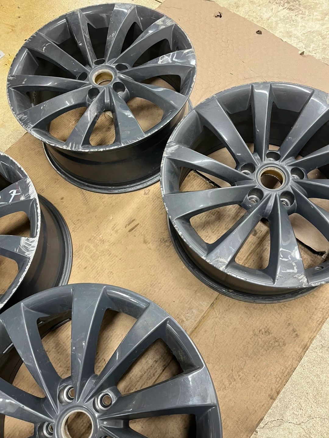 Selling a set of four used alloy wheels. They are a dark grey colour and appear to be 17-inch. Some scuffing and minor damage are visible on the rims. These would make a good replacement set or a project.