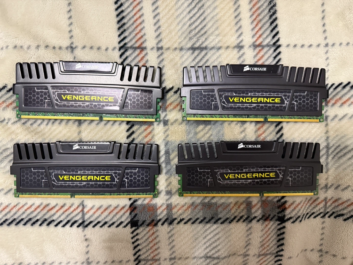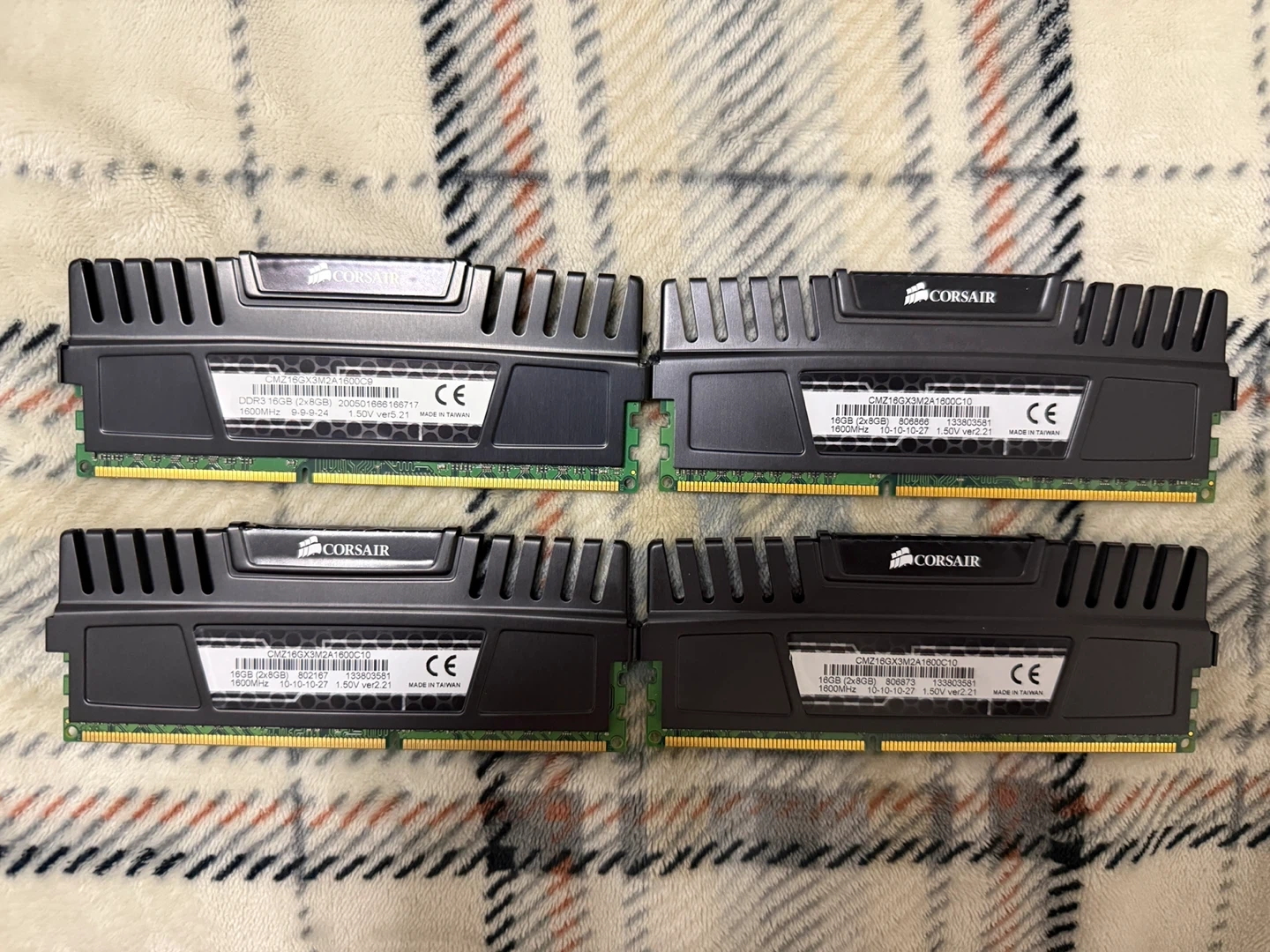 Set of four Corsair Vengeance LPX 8GB DDR3 RAM modules. Each stick has a speed of 1600MHz and a voltage of 1.5V. Totaling 32GB of memory.
