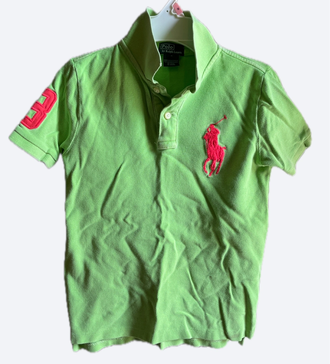 Polo Ralph Lauren boys' polo shirt. Size 7. Lime green colour. Features a pink embroidered logo on the chest and pink embroidered number on the sleeve. Excellent condition
