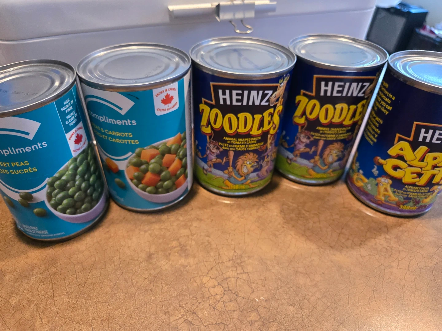 Three cans of Heinz pasta in tomato sauce: Zoodles (animal shaped) and Alphabet Pasta. Two cans of Compliments vegetables: Sweet Peas and Peas & Carrots. All are 398ml or similar size.