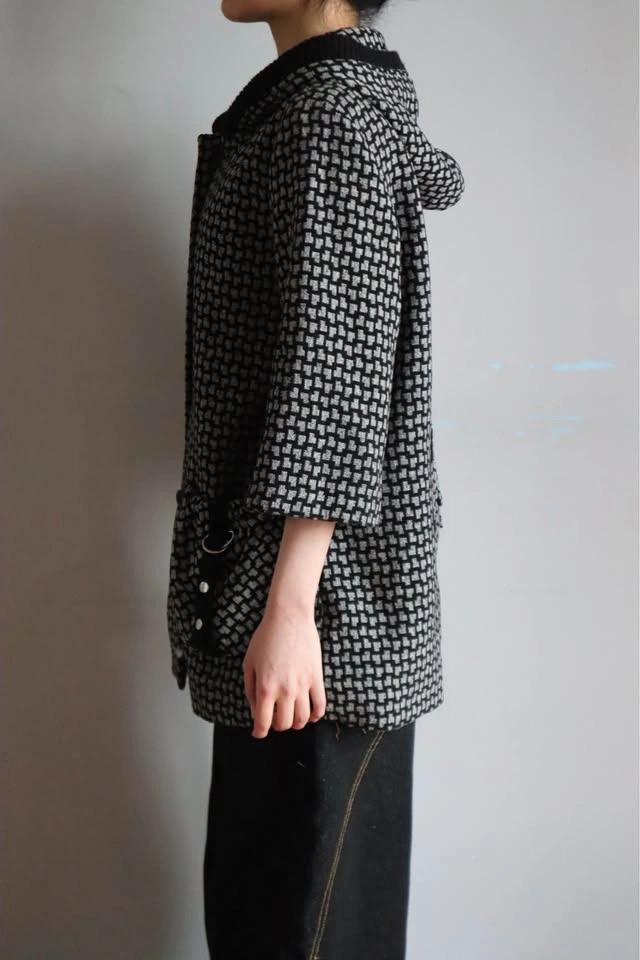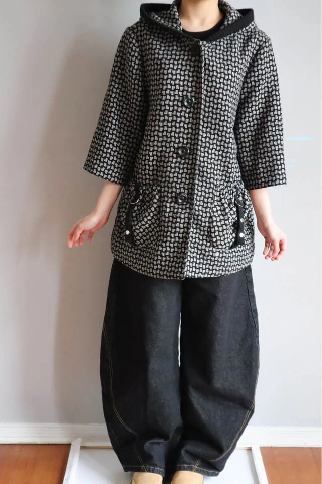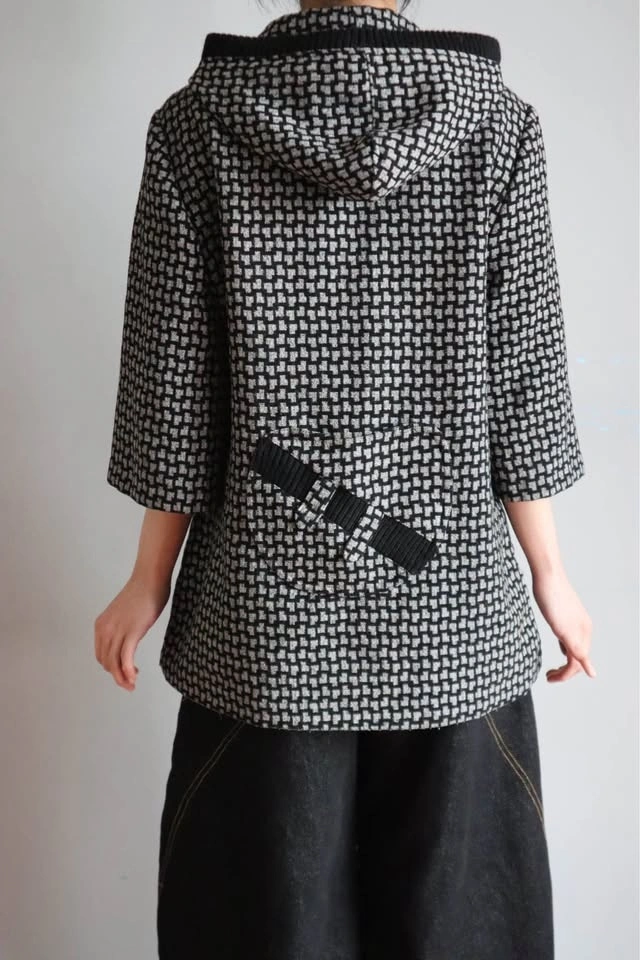 Stylish black and white patterned hooded jacket with 3/4 sleeves. Features cute ruffled pockets with metal ring details and a button front closure.