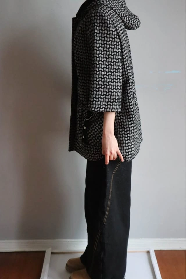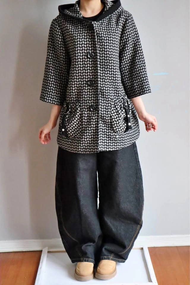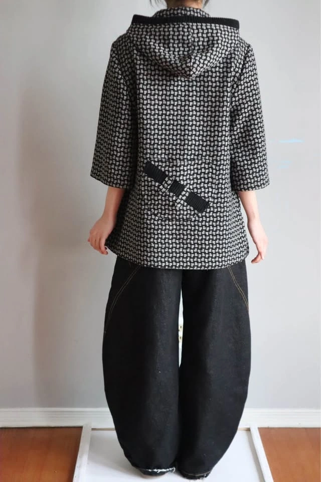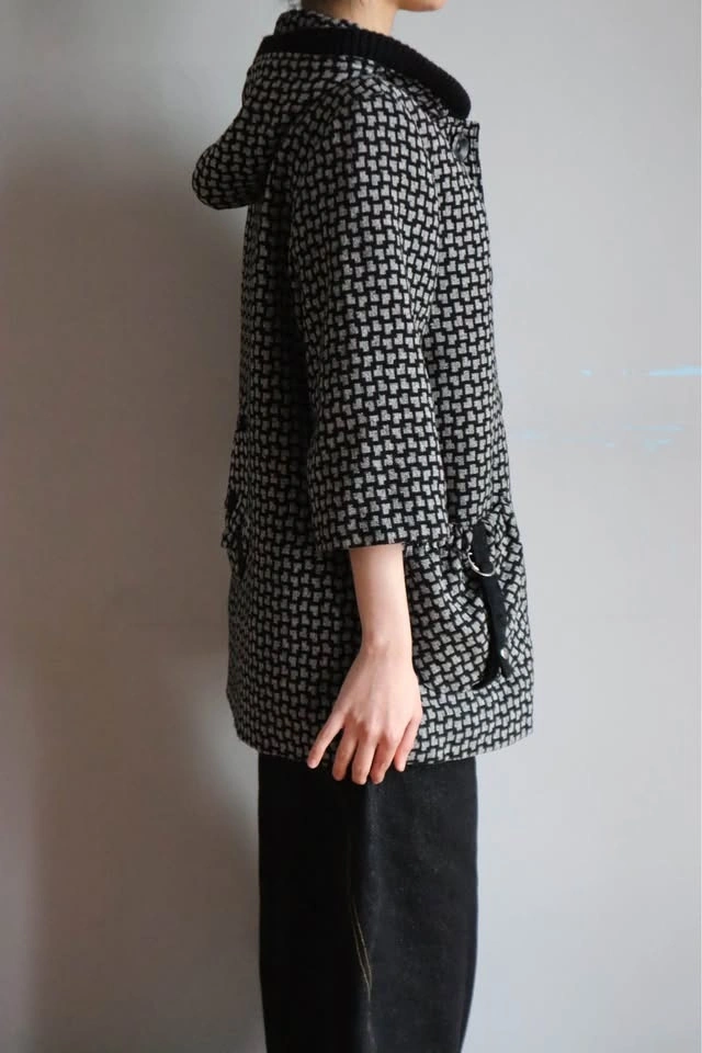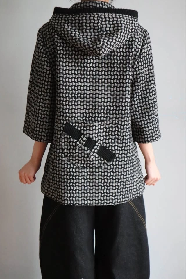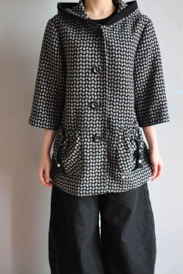Stylish black and white patterned hooded jacket with 3/4 sleeves. Features cute ruffled pockets with metal ring details and a button front closure.