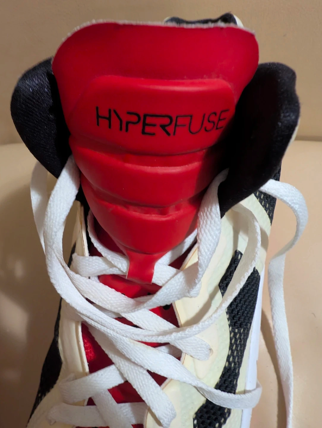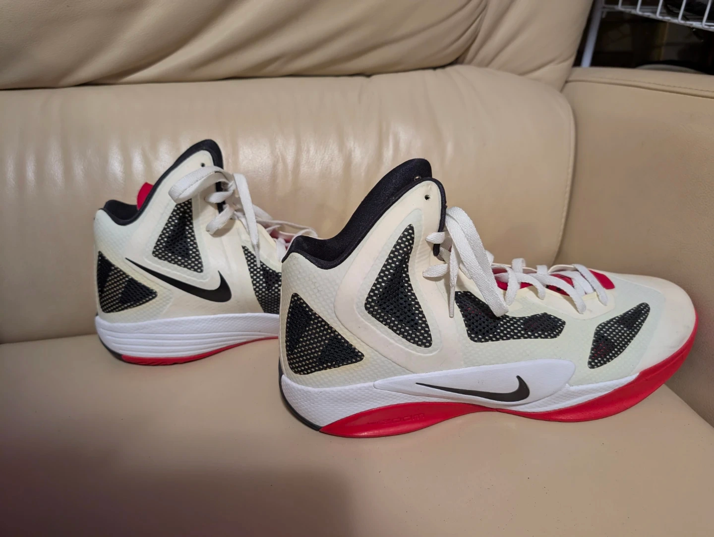Nike basketball shoes with a Zoom Hyperfuse design. Features white, black, and red accents. Lace-up closure. Suitable for athletic performance.