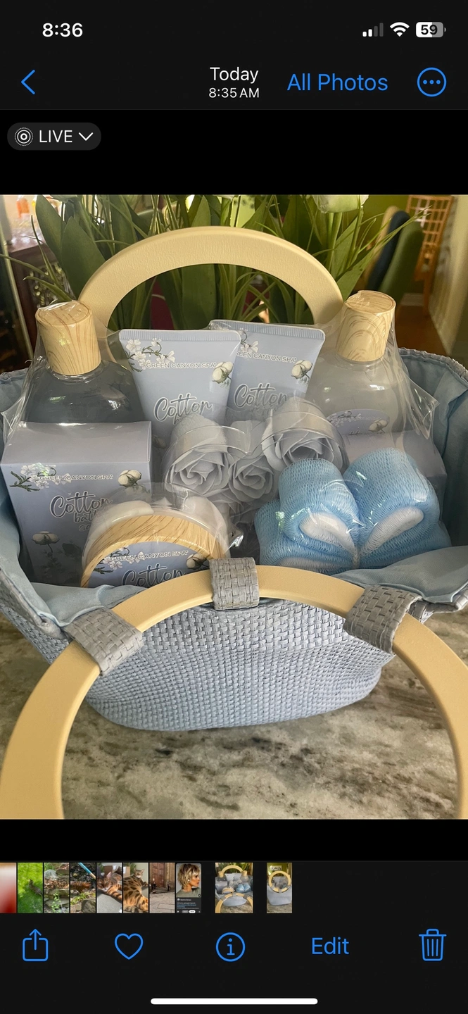Shampoo ect… and presented in a cute baby blue basket with wooden handles.