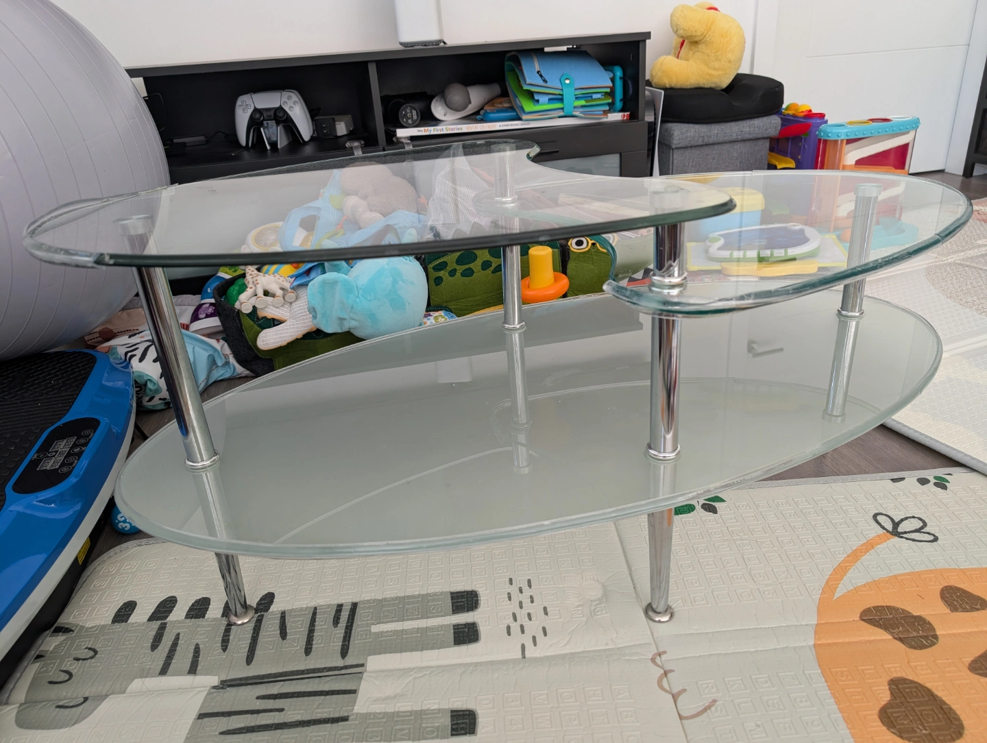 Unique glass top coffee table. Two-tiered design. Chrome-coloured legs. Oval shape. Modern style.