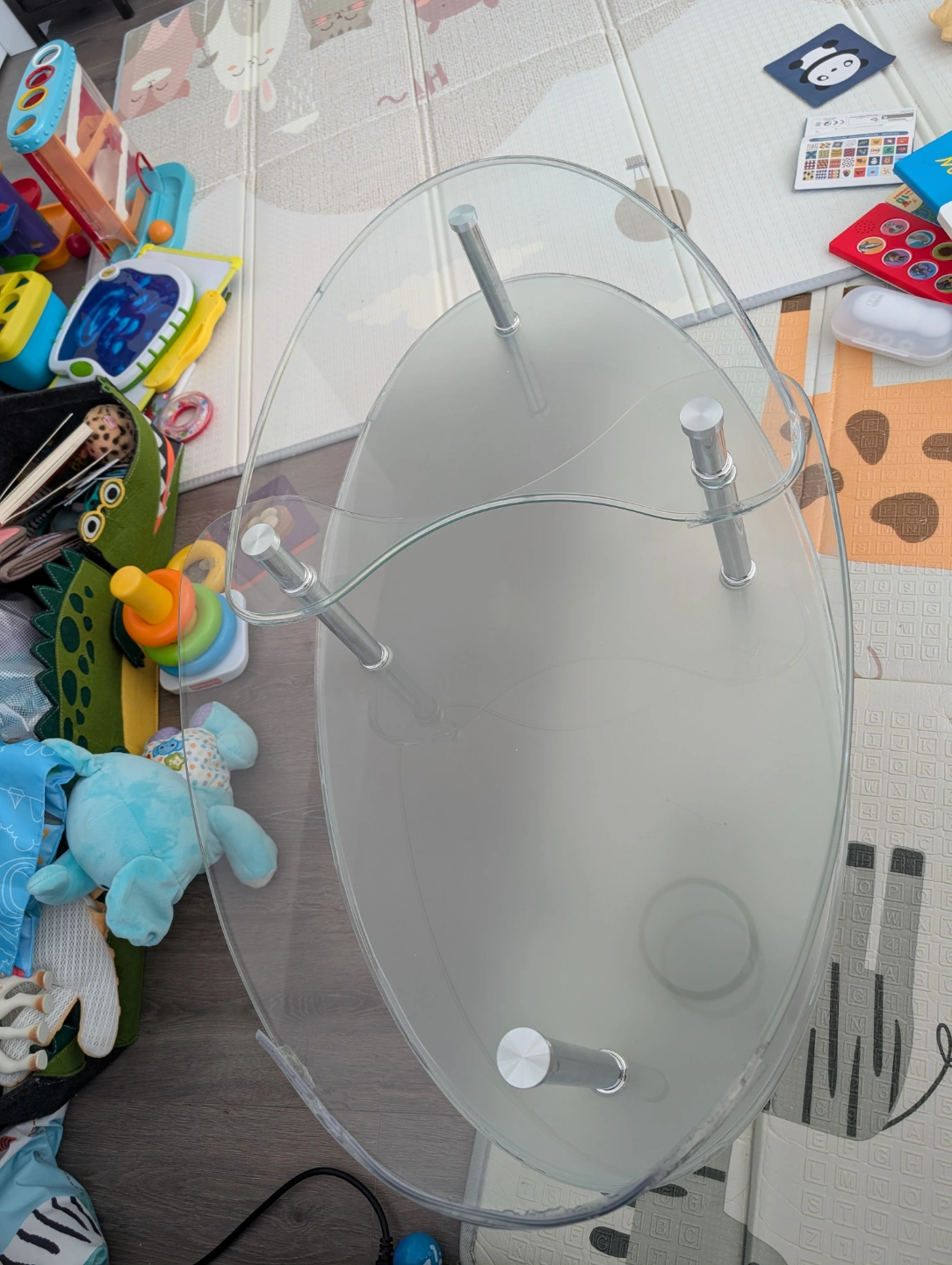 Unique glass top coffee table. Two-tiered design. Chrome-coloured legs. Oval shape. Modern style.