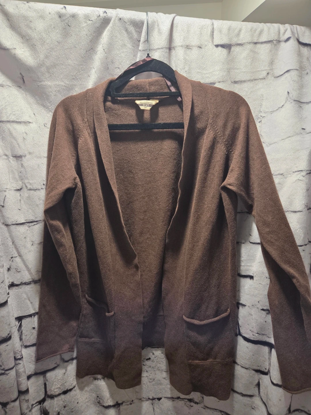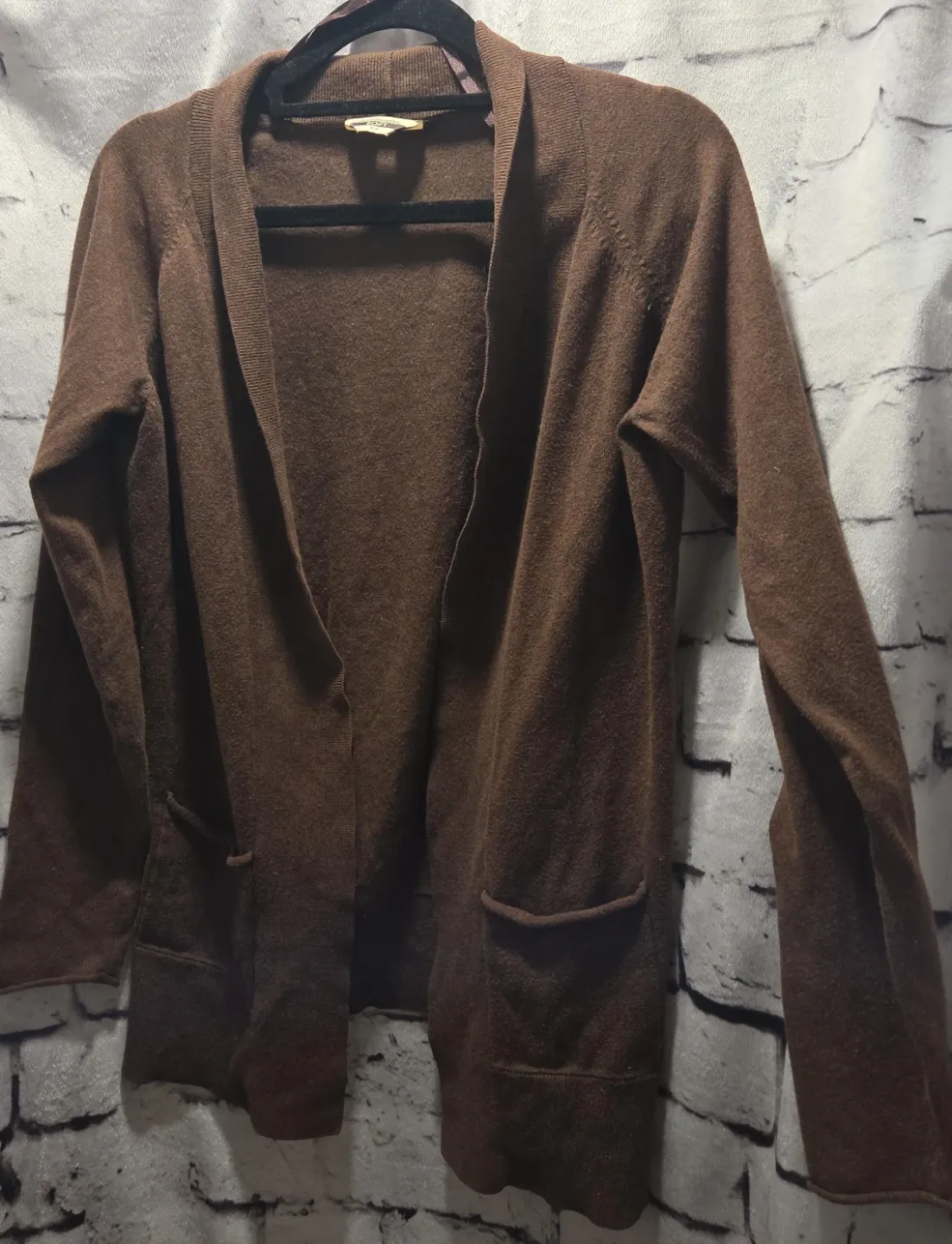A cozy brown cardigan sweater with pockets. It's made of a soft knit material. Perfect for layering on cooler days! Denver Hayes