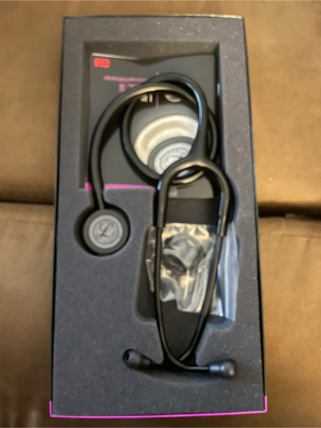 Black 3M Littmann Classic III stethoscope. It's in its original packaging with included accessories. This stethoscope is a common tool for auscultation.
