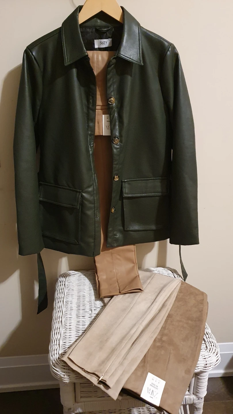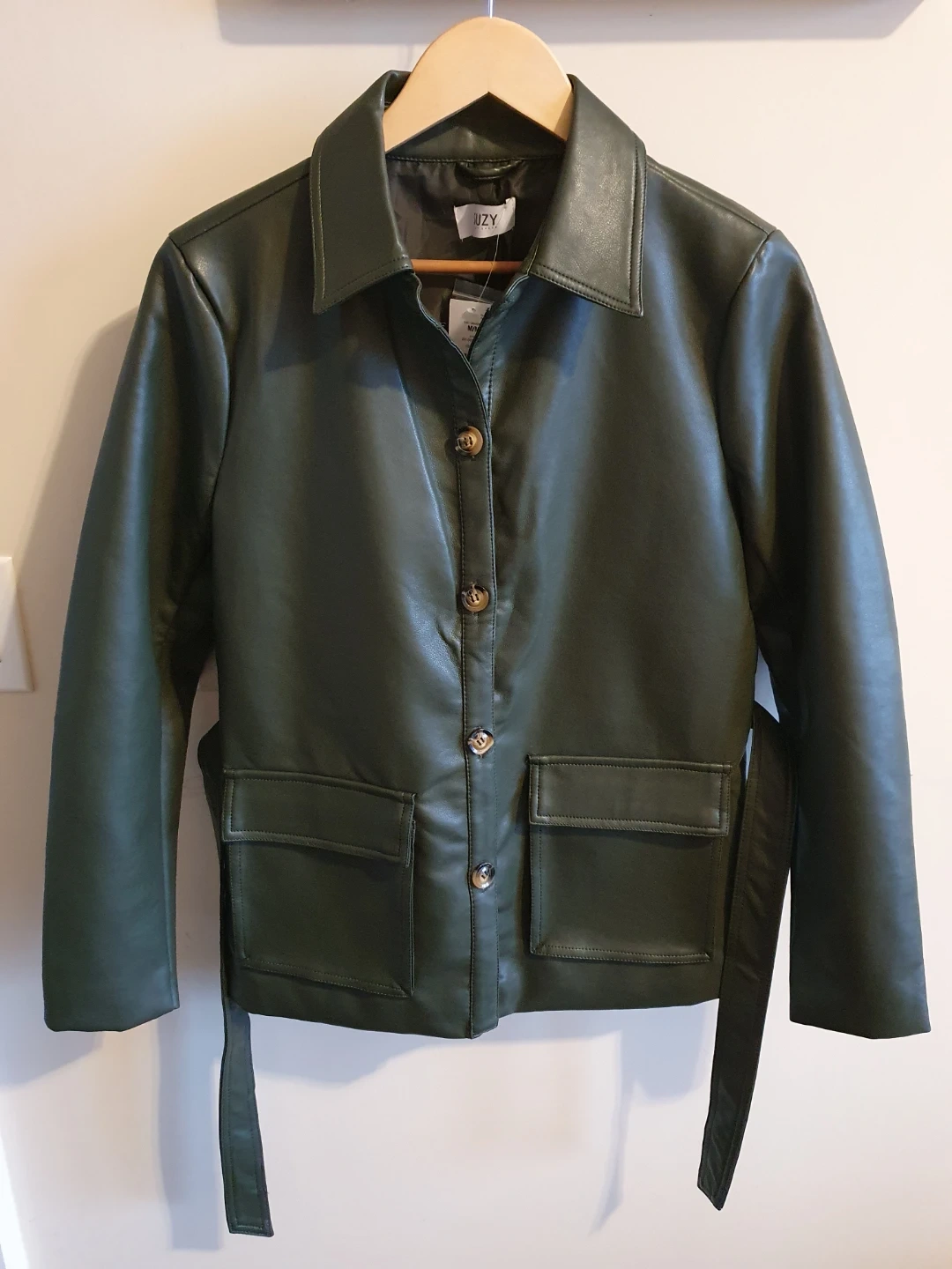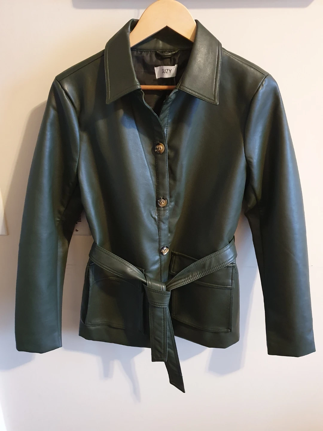This Suzy jacket is a stylish faux leather piece in a deep green colour. It features a belted waist and button-up front. It has a classic collar and two front flap pockets.