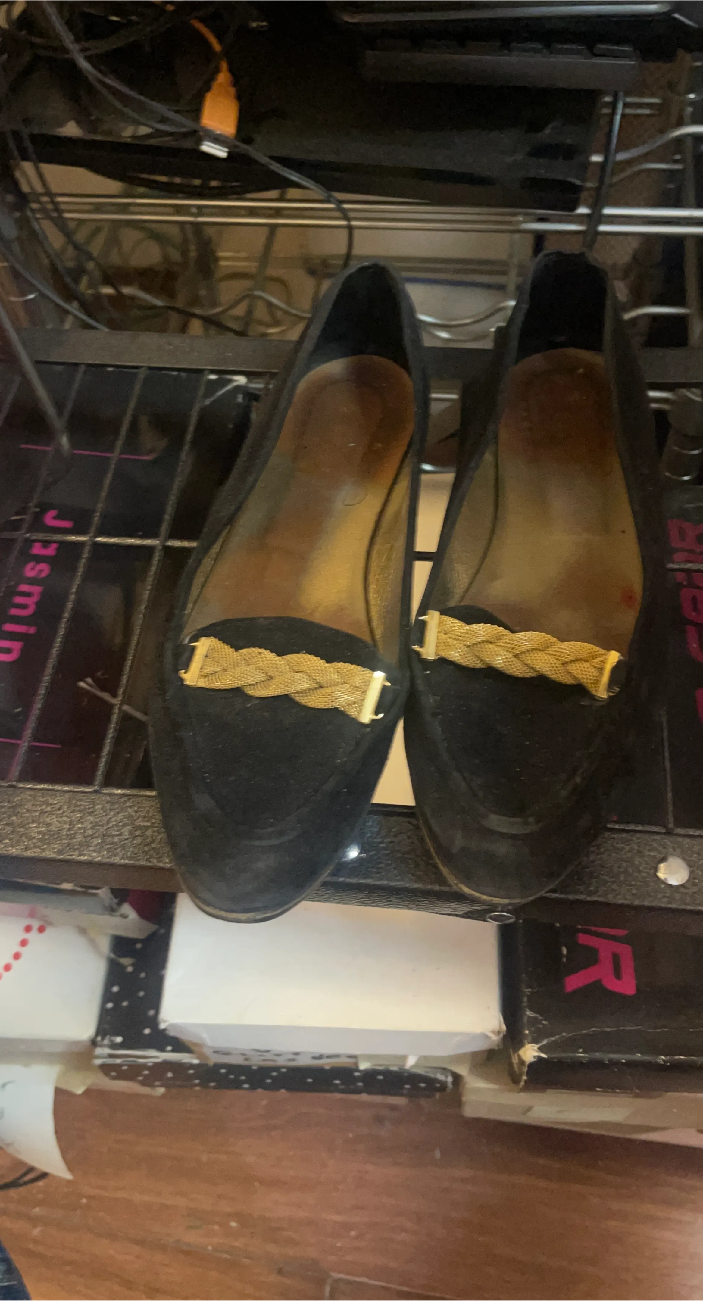 Comfortable black suede loafers featuring a braided gold embellishment across the vamp. These slip-on shoes offer a classic silhouette. Material appears to be suede with a synthetic sole.