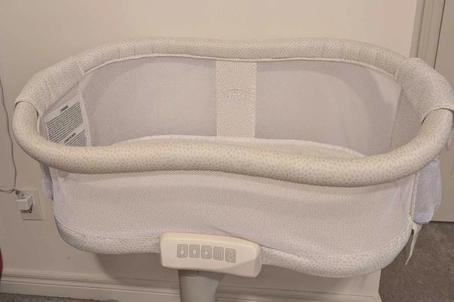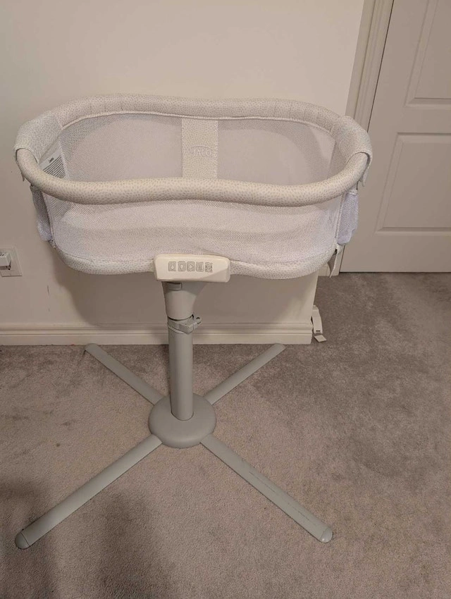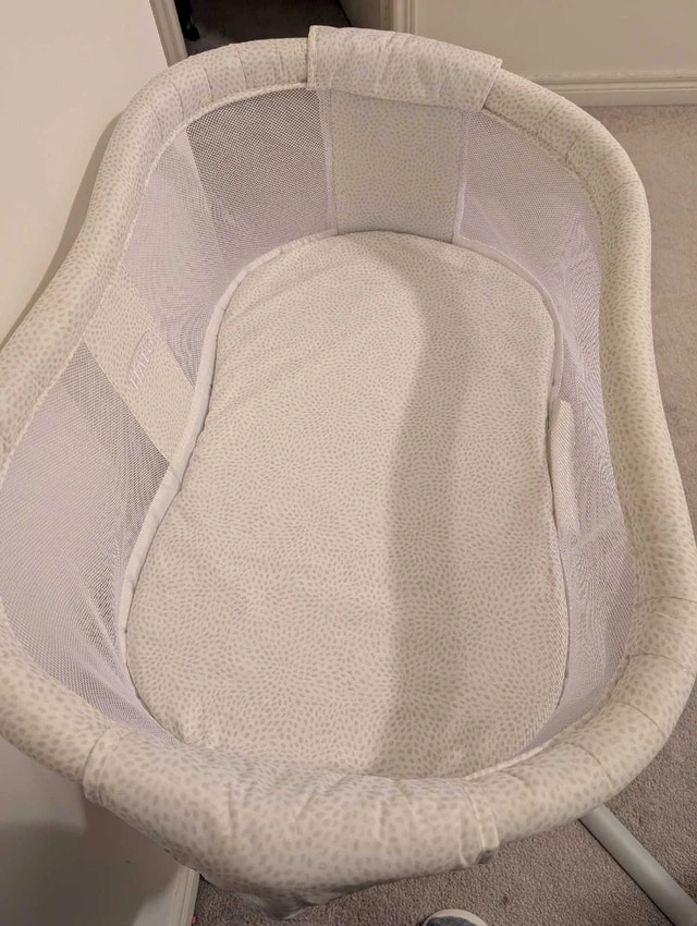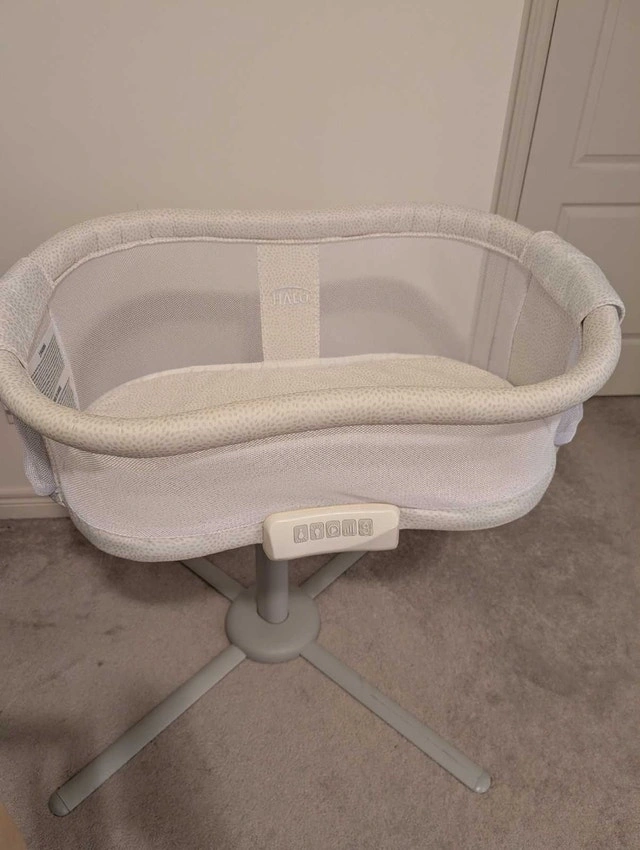 Used Halo Bassinest Premiere Swivel Sleeper with 2 fitted sheets. This bassinet is designed to bring your baby close, even right next to you in bed, which is great for the first few months. The condition is good with all functions working. From a smoke-free and pet-free home. Key features include: 360° swivel, soothing sounds and vibrations, adjustable height, and breathable mesh walls. If the ad is up, the sleeper is available.
