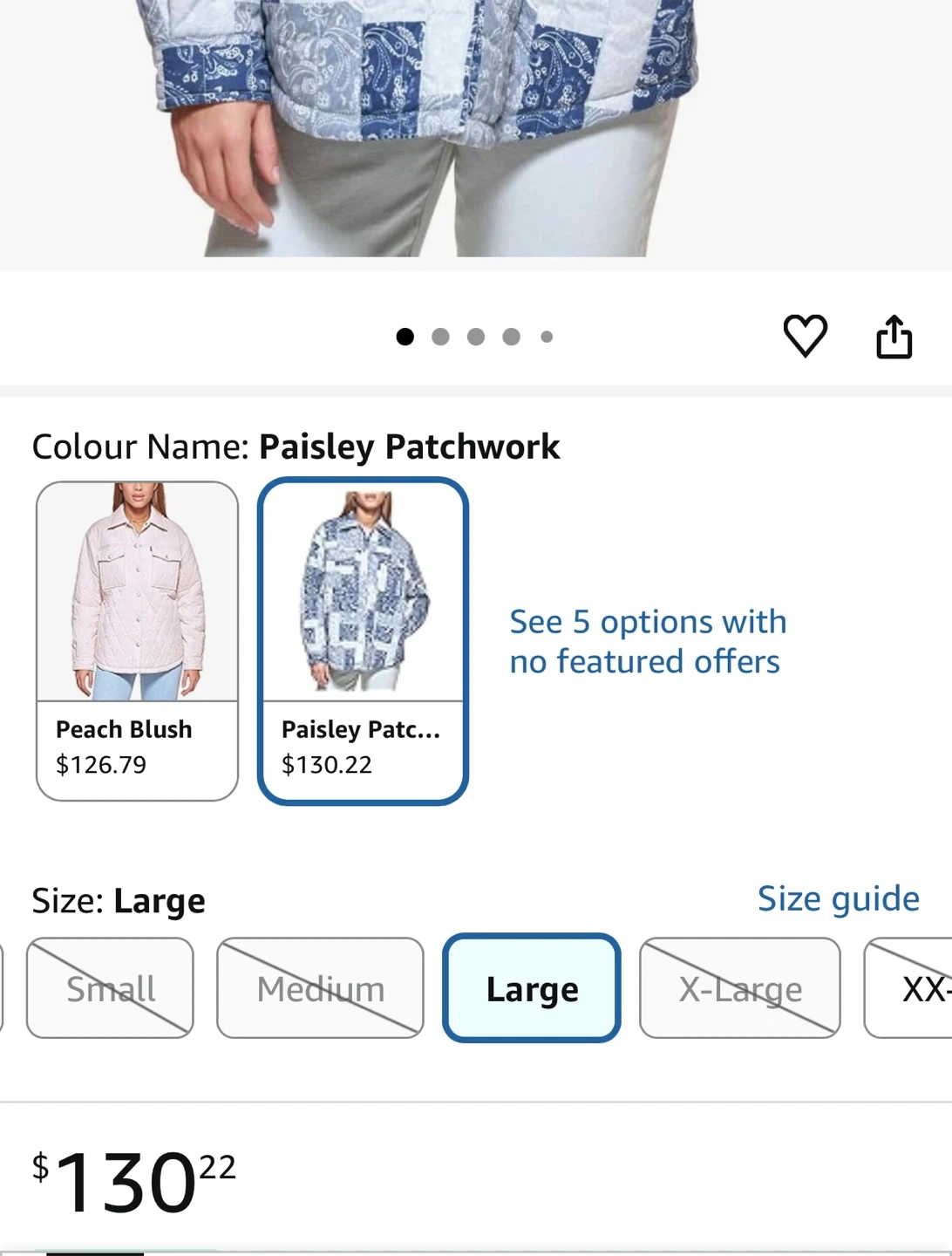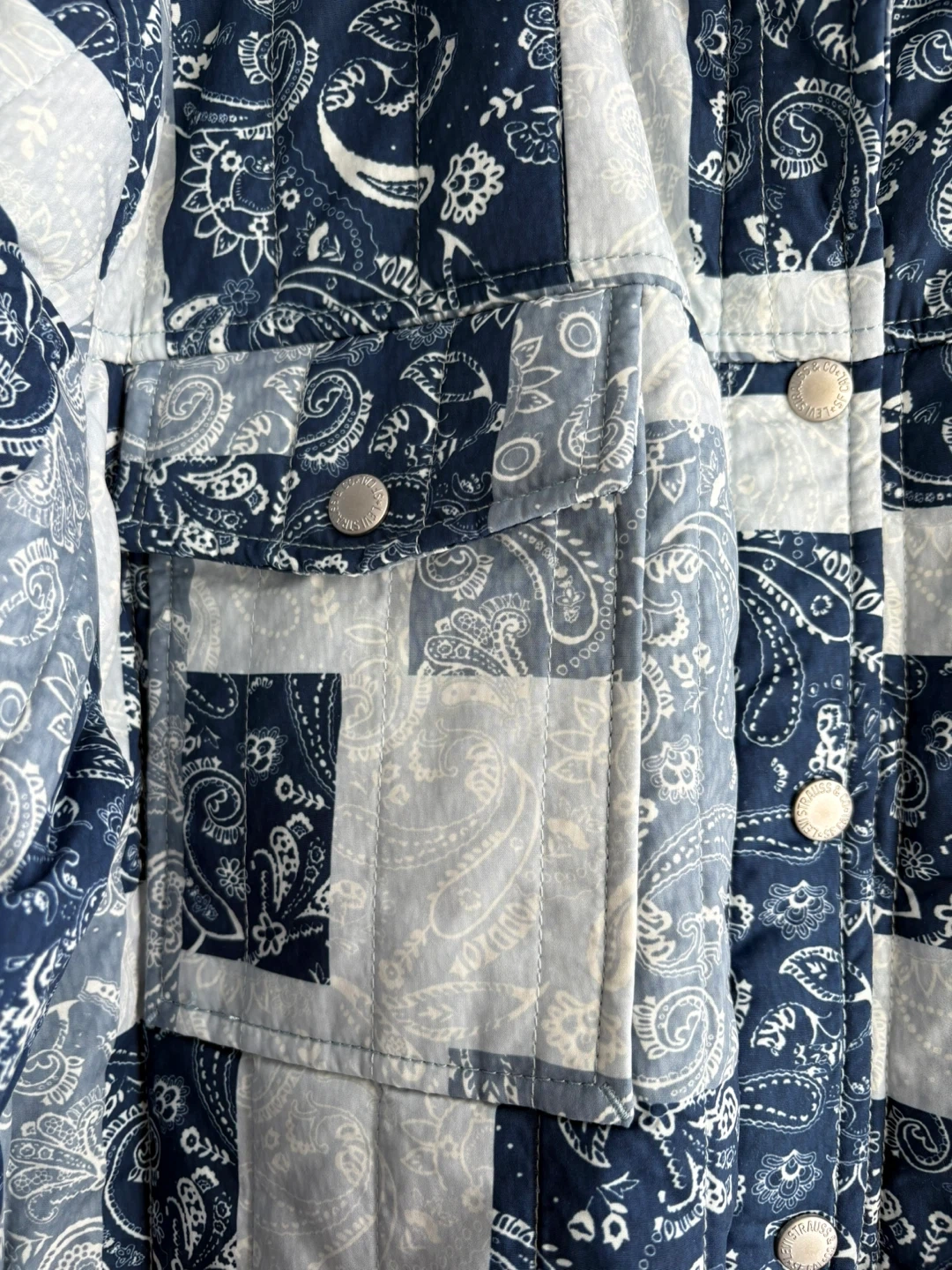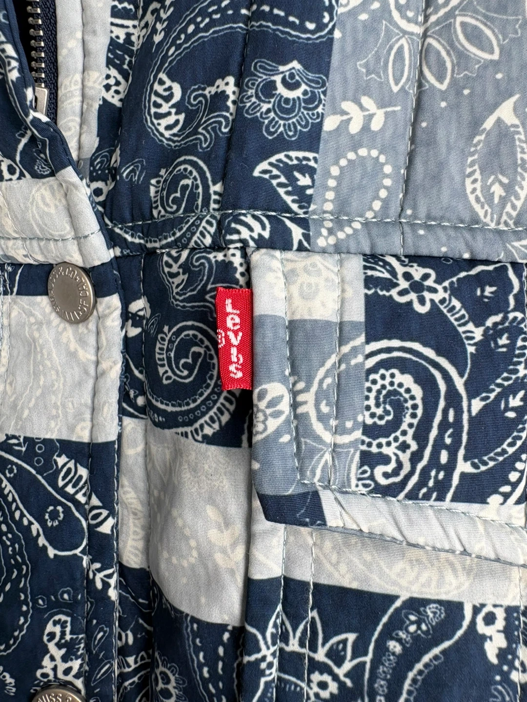This is a Levi's quilted shirt jacket in a paisley patchwork design. It's size large and features a full button front with chest pockets. Perfect for layering on cooler days! Great for the spring unpredictable weather as well!