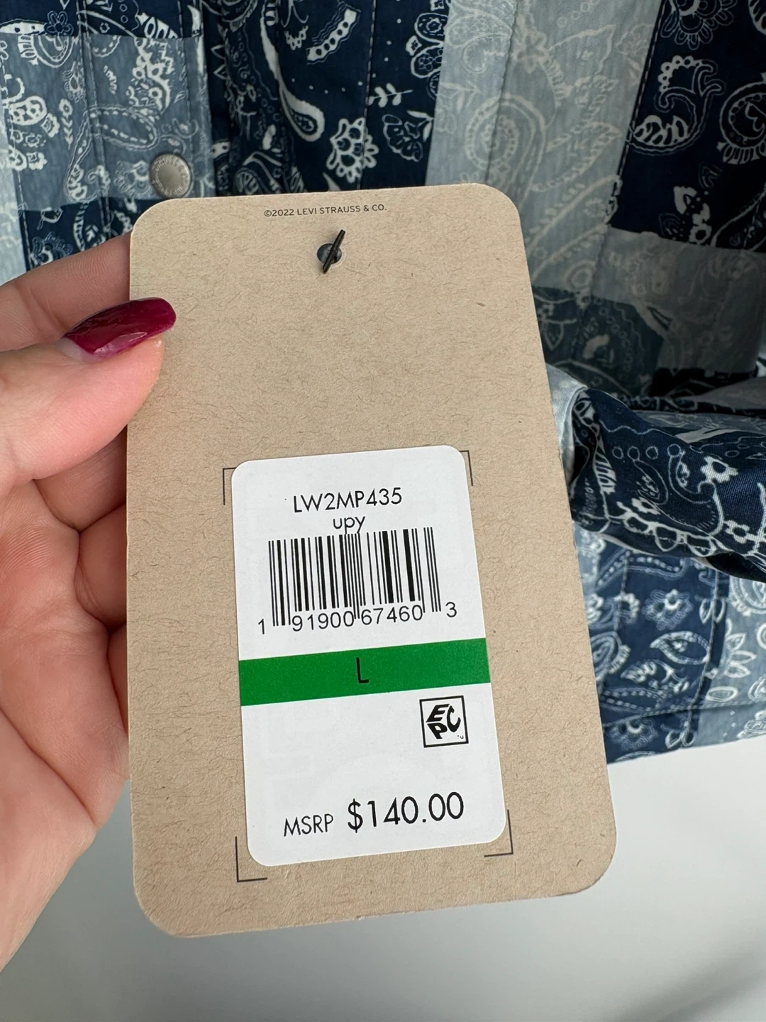 This is a Levi's quilted shirt jacket in a paisley patchwork design. It's size large and features a full button front with chest pockets. Perfect for layering on cooler days! Great for the spring unpredictable weather as well!