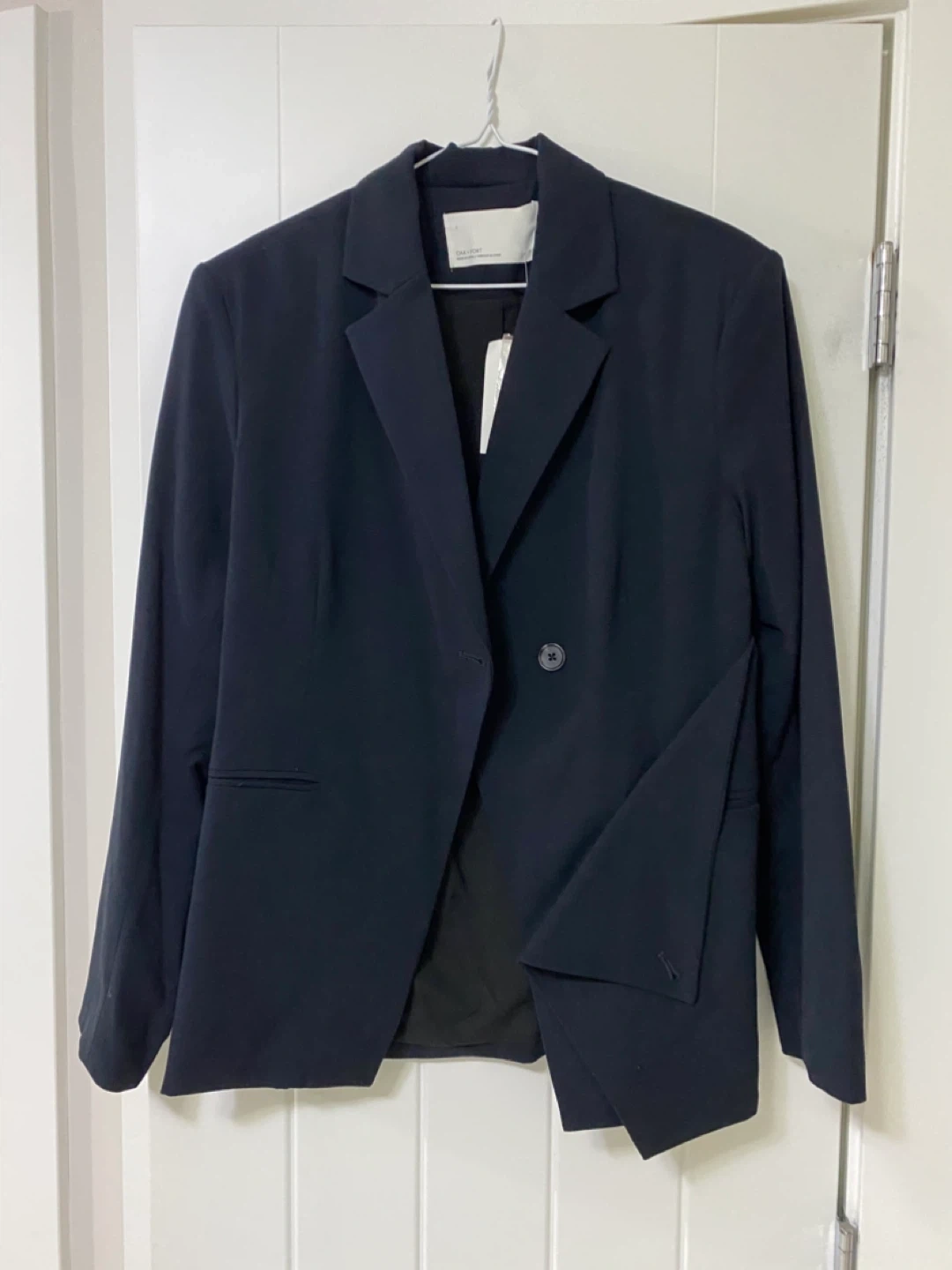 Brand new Oak + Fort blazer in black. It's a size XS. This piece features a double-breasted closure with a unique asymmetrical hemline. Great for layering over a top or dress for a chic look.