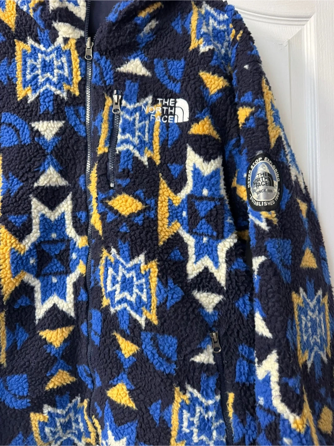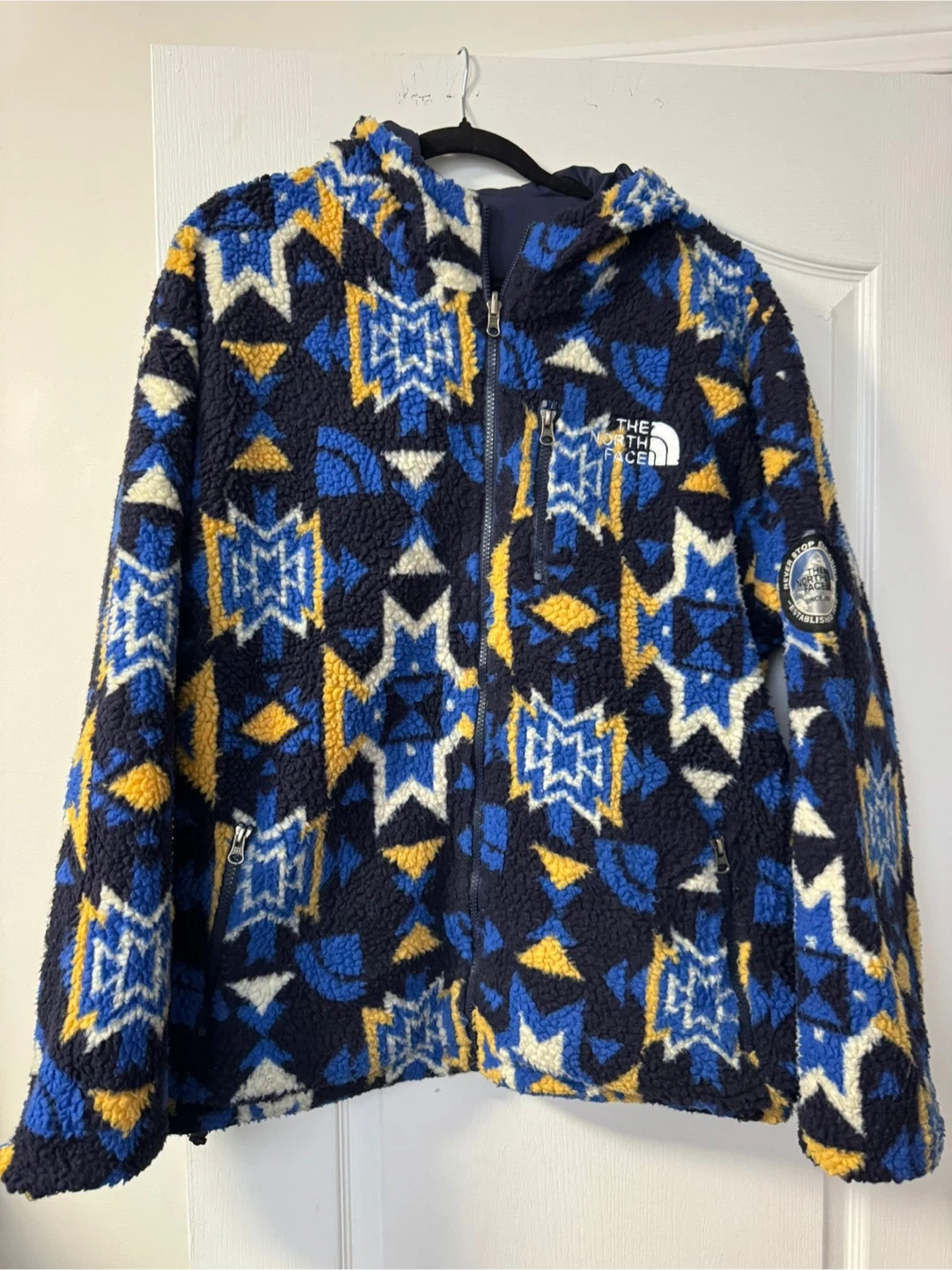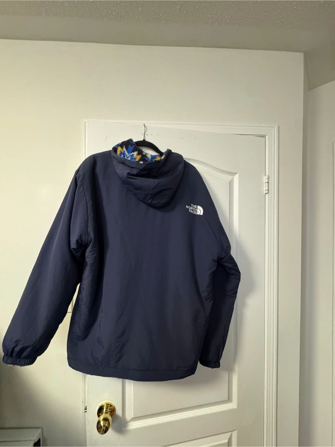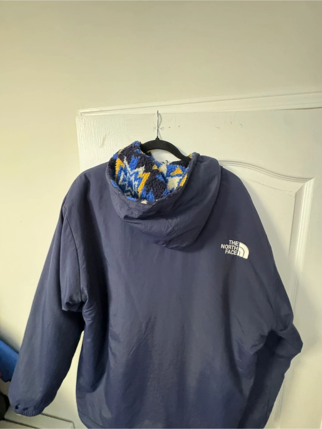 This reversible jacket from The North Face features a cozy fleece interior with a colourful pattern and a smooth navy blue exterior. It's designed for warmth and versatility. Perfect for chilly days outdoors! XXL