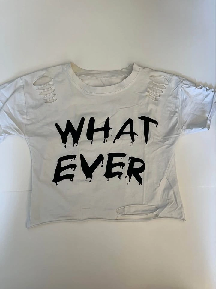 Cropped distressed t-shirt with “Whatever” graphic print. $5, good condition. Pickup near Sheppard and Warden. Message for more information. Check out my other listings!