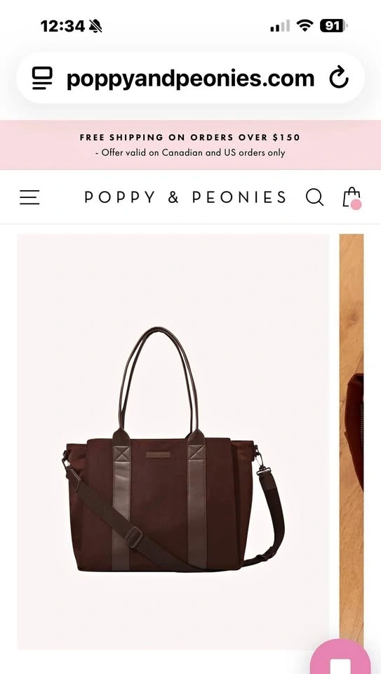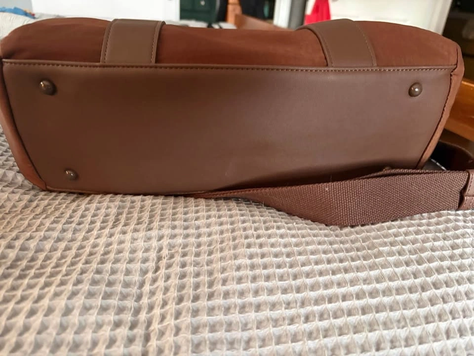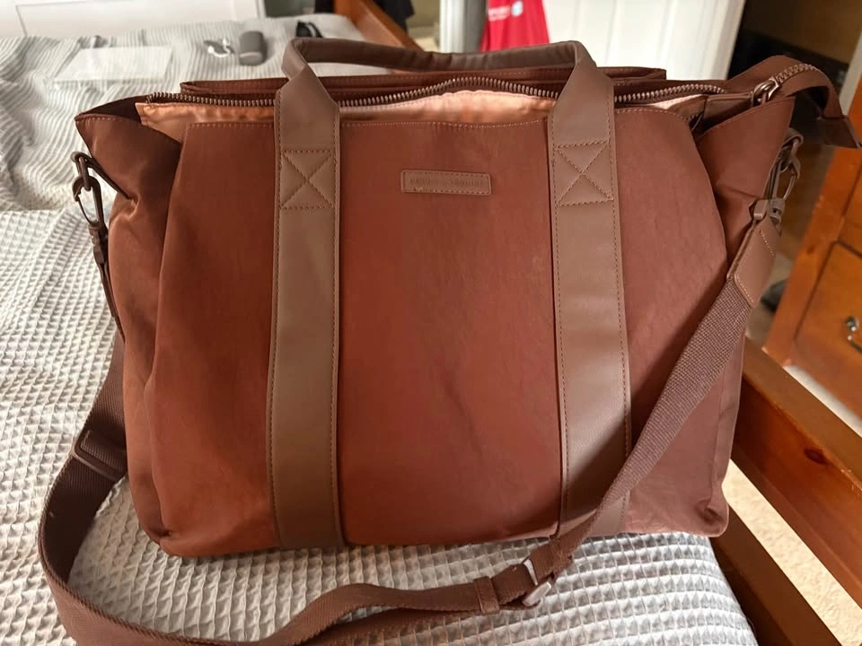 This Poppy & Peonies Daily Tote in Espresso is a structured bag made of nylon fabric with vegan leather trim. It has both top handles and a detachable shoulder strap, with an interior featuring lots of compartments for organization. Great for everyday use or as a stylish diaper bag. From a smoke-free home. Used twice for my laptop. Pickup in South Windsor.