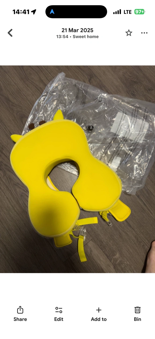 This adorable yellow giraffe float by KLEIOU is perfect for kids! It looks like it's in great condition and ready for some fun in the water