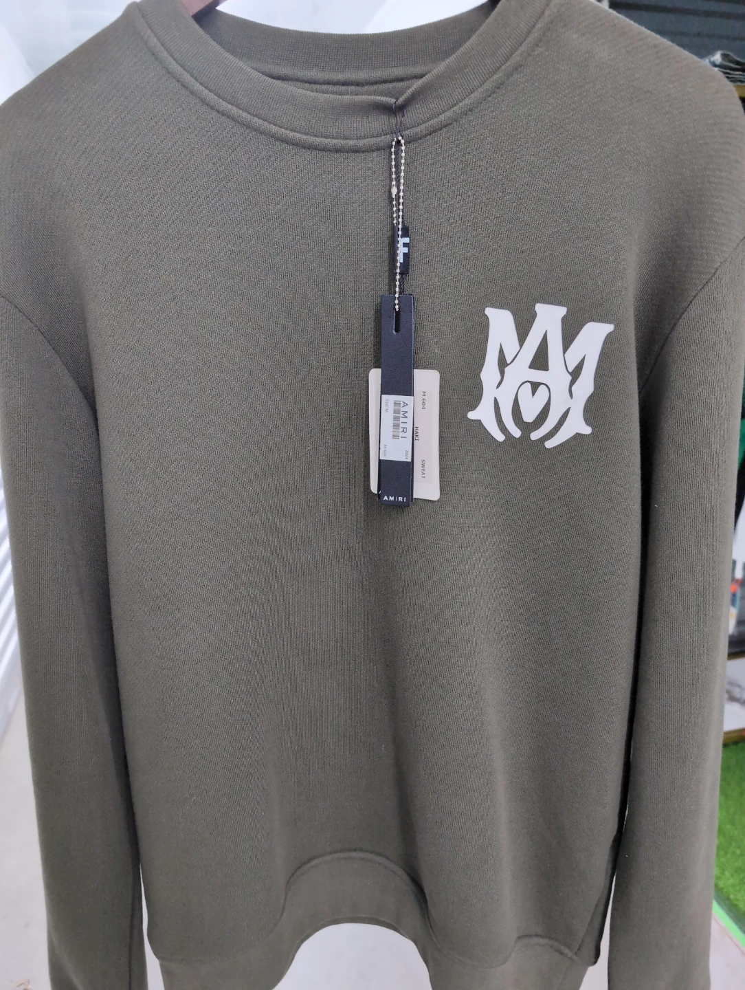 Selling an AMIRI sweatshirt in size medium! It's a cool haki colour and features the brand's logo on the front and back. Perfect for adding a stylish touch to your wardrobe