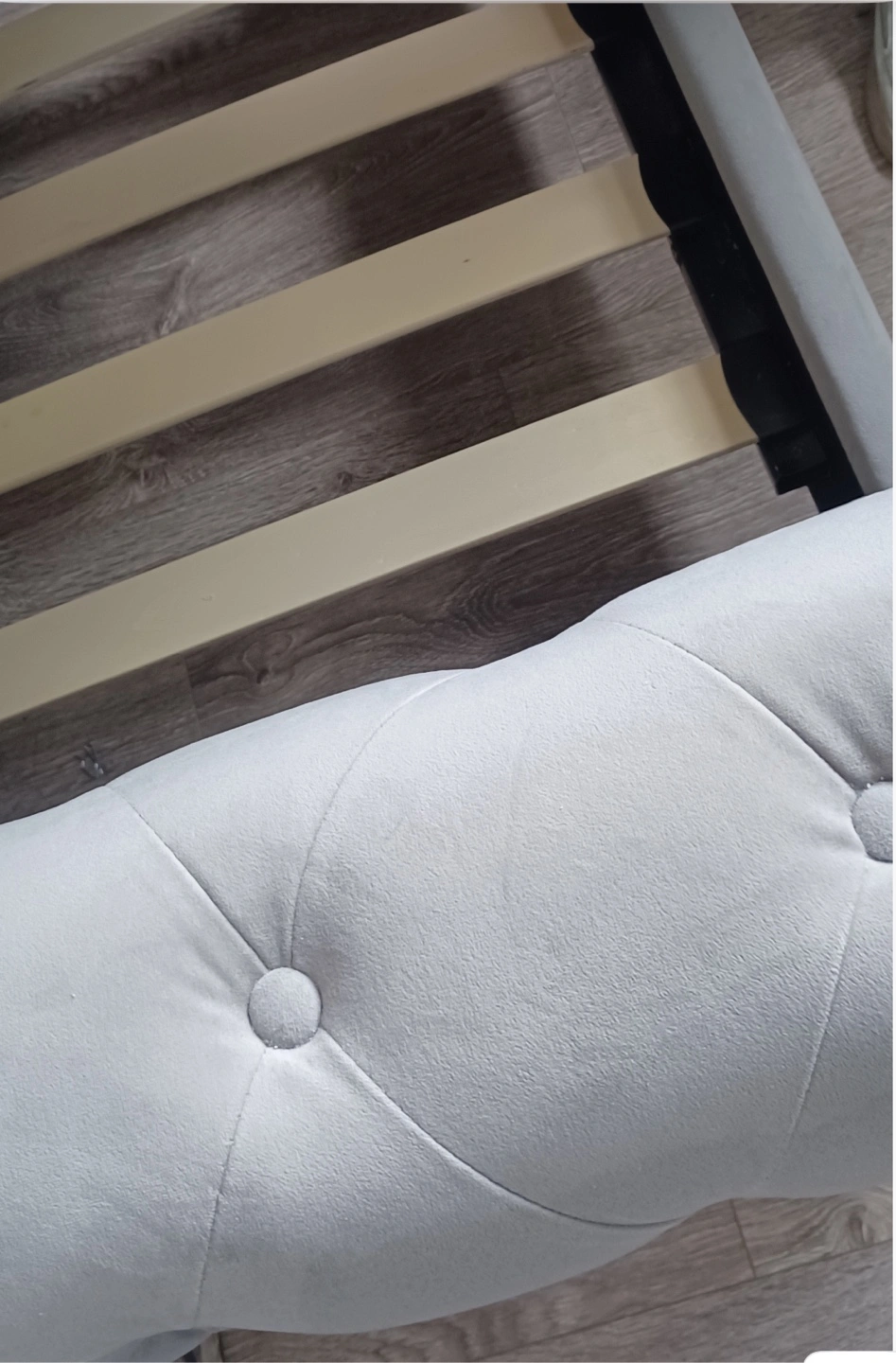 Grey / Silver velvet upholstered bed frame. Features a button-tufted headboard and footboard. Includes wooden legs. A nice bed will quickly become your favourite place.