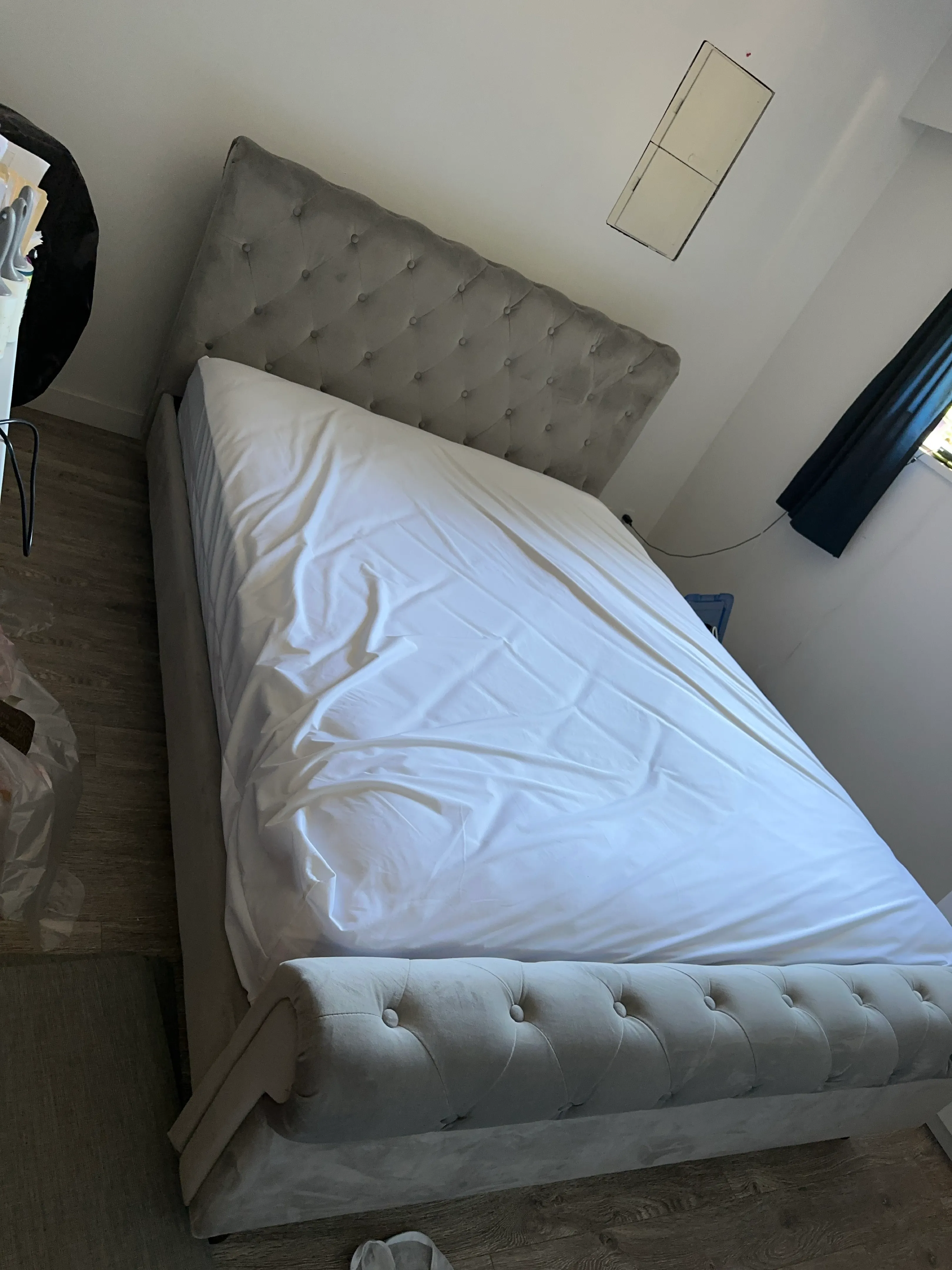 Grey / Silver velvet upholstered bed frame. Features a button-tufted headboard and footboard. Includes wooden legs. A nice bed will quickly become your favourite place.