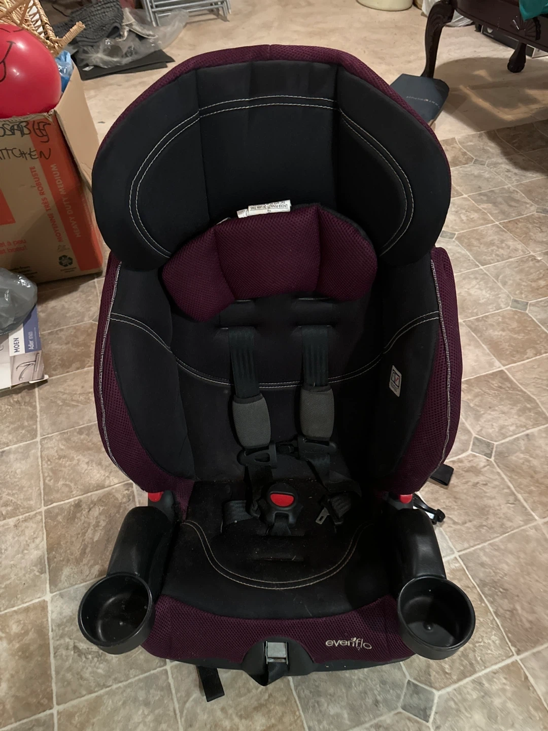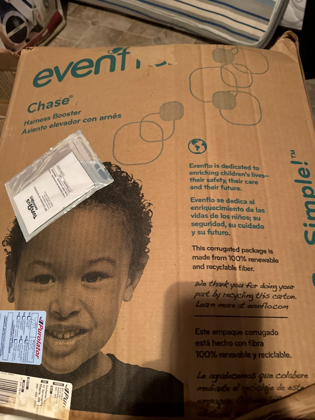 Evenflo Chase Harness Booster seat for children. This corrugated package is made from 100% renewable and recyclable fiber. It's a great addition to keep your child safe during car rides.