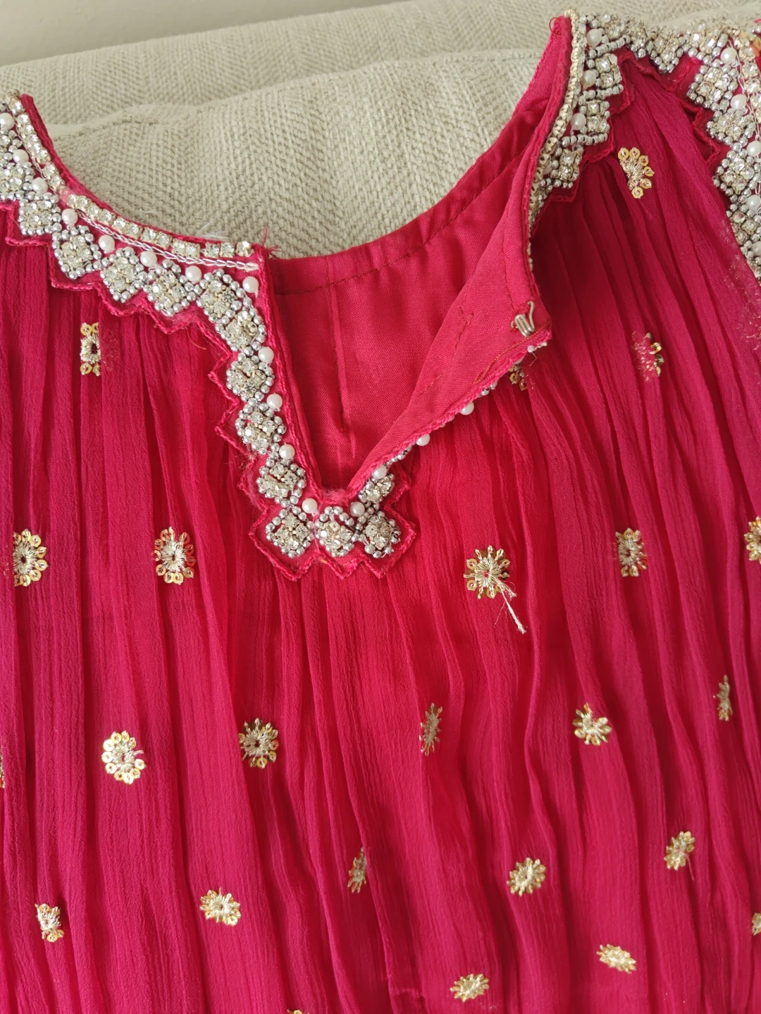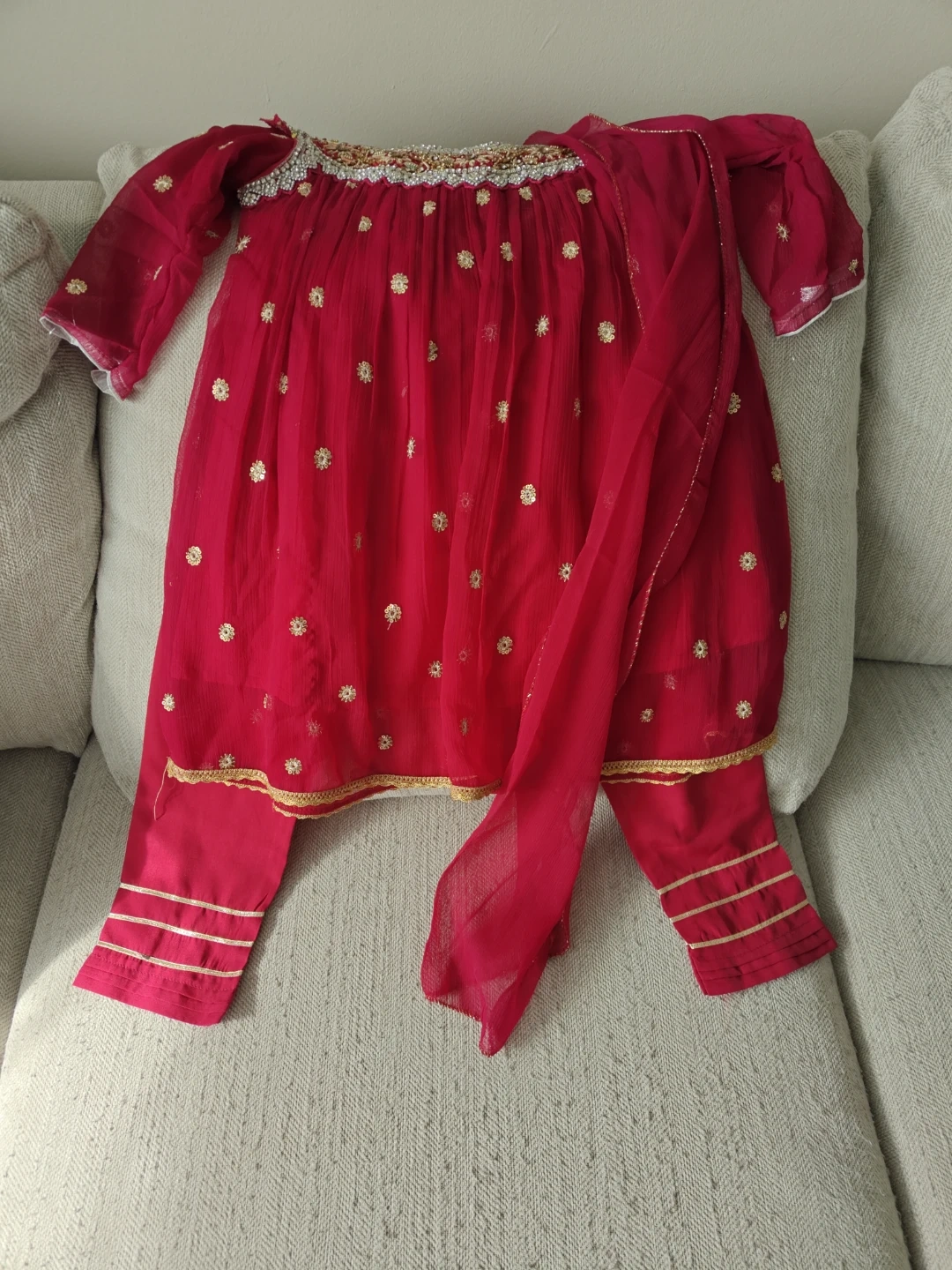 Bright red dress for a girl, adorned with gold floral embroidery and sparkling beadwork around the neckline. It features sheer sleeves and a flowy silhouette. This dress is perfect for special occasions or parties!