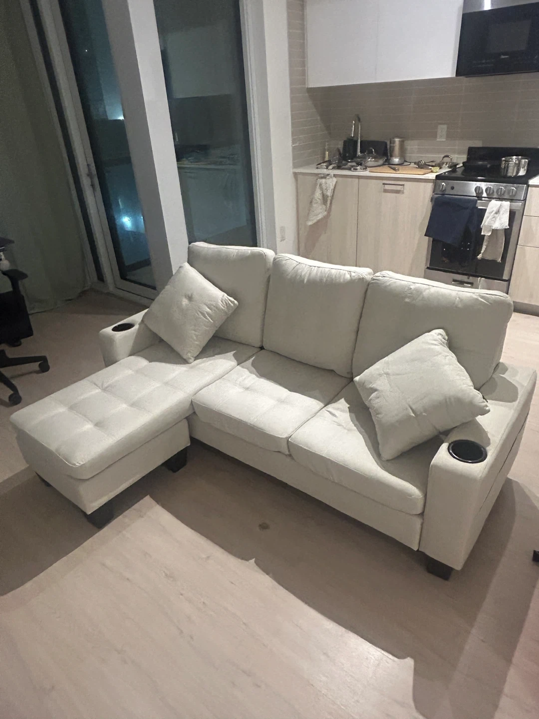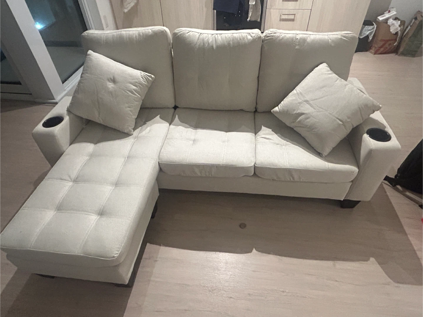 Brand new sectional sofa in a light cream or white colour. It features a chaise and two convenient cup holders built into the armrests. Comes with two matching throw pillows. It's a great size for an apartment.