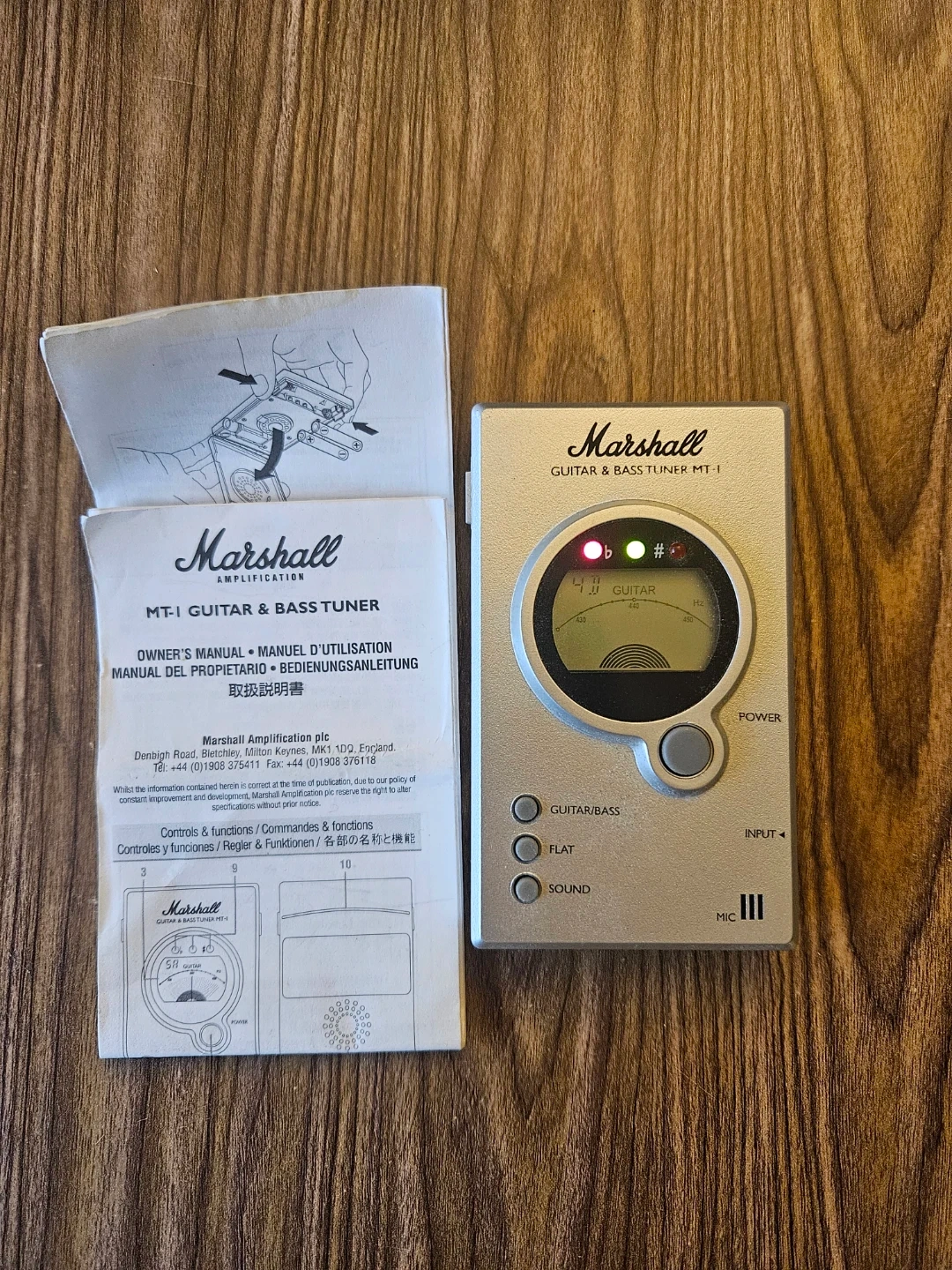 This is a Marshall MT-I guitar and bass tuner. It's a compact device for tuning your instruments. It includes an owner's manual.