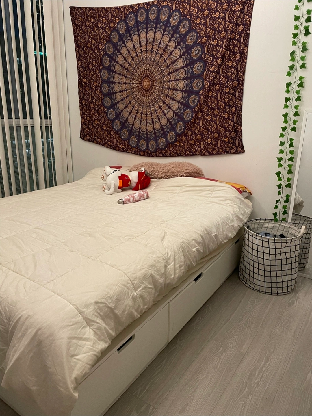 AVAILABLE NOW! NEGOTIABLE (for a decent offer) White bed frame with storage drawers. A great space saver for condos. Will disassemble partly if required. Drawers on both sides, provides as much storage as a dresser 🤩