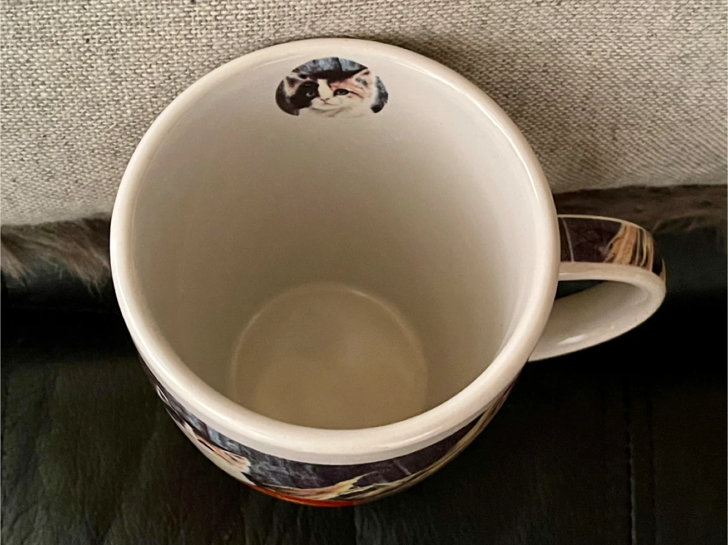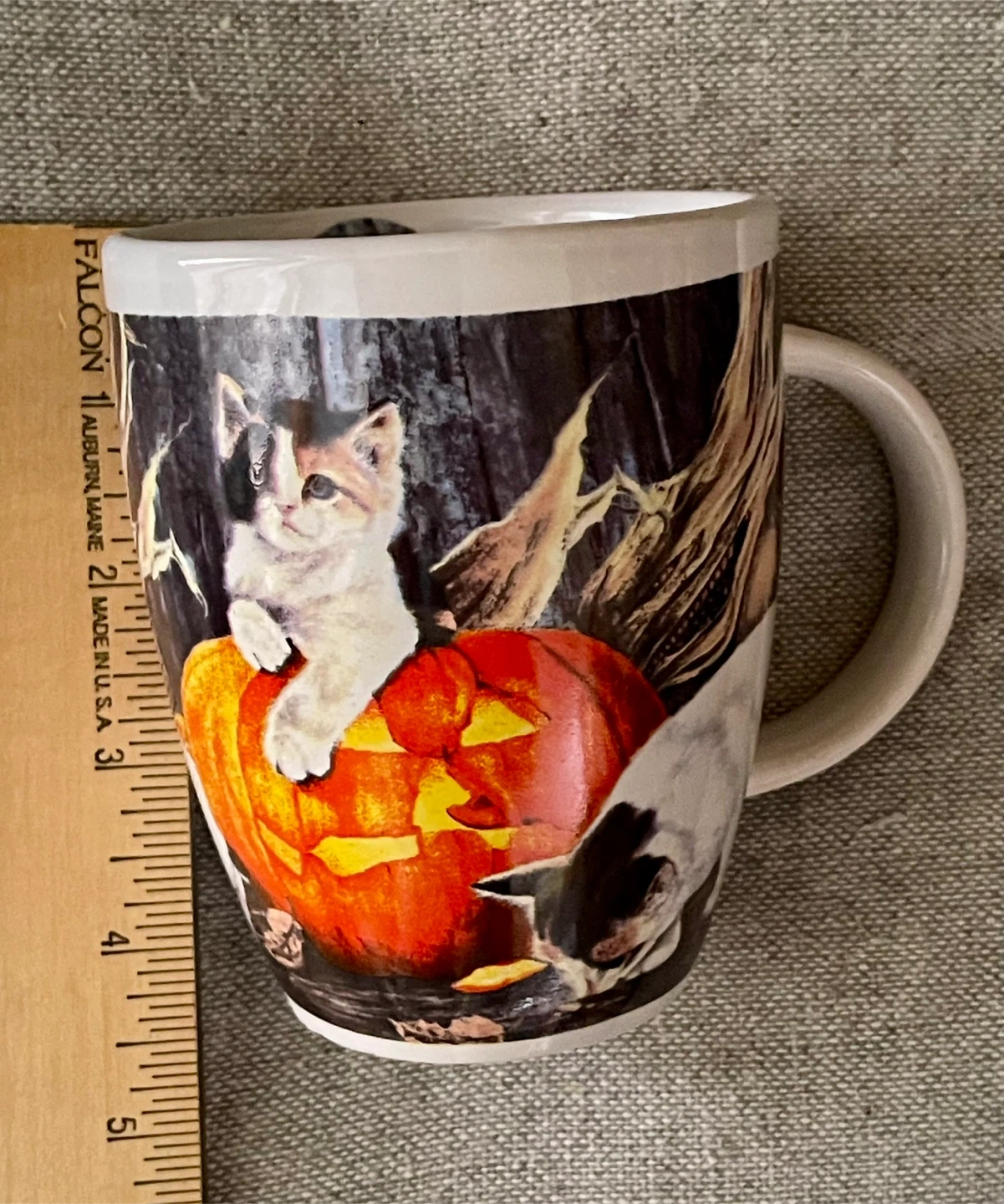 This festive mug features adorable kittens playing with a jack-o'-lantern. It's a great way to get into the Halloween spirit! Made of ceramic. Preowned in excellent, like new condition.