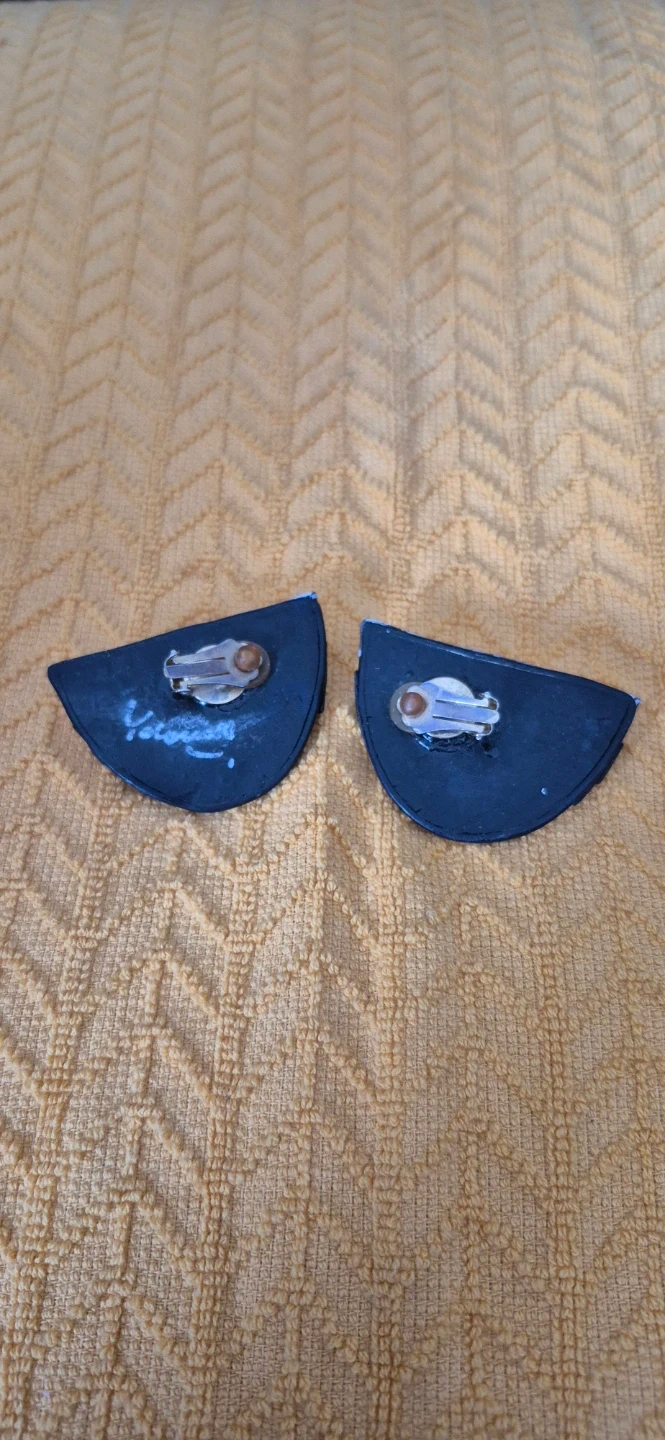 Selling a pair of vintage clip-on earrings. They have a unique design with a floral rhinestone detail on top. The earrings are in good condition and ready to add a touch of retro charm to your collection. $1.00 each.